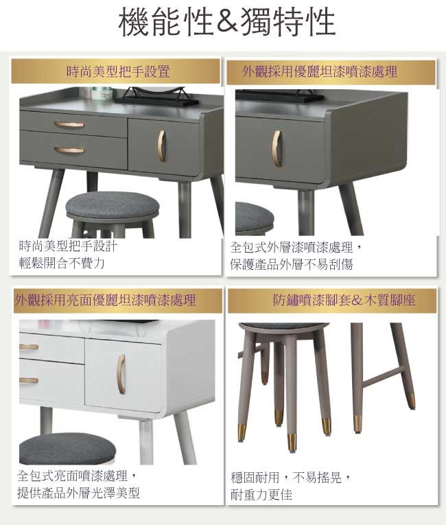 商 品 介 紹 | 【綠家居】卡利2.7尺固定式鏡面鏡台/化妝台組合(三色可選+含化妝椅) 三色可選+現代簡約風格+安心材質製造,整體採用防蛀木心板+防鏽噴漆腳套&木質腳座+五金滑軌結構+強化玻璃鏡面等安心材質製造,產品外層採用防潮耐磨噴漆處理搭配採用固定式鏡面櫃+三抽屜+內&外開放式收納等空間設計,全由專人配送到家,專業安心服務,替你省下更多時間! 【商品特色】 三色可選+現代簡約風格+安心材質製造,使用放心+搭配居家更便利 採用防蛀木心板+防鏽噴漆腳套&木質腳座+五金滑軌結構+強化玻璃鏡面等安心材質製造 產品外層採用防潮耐磨噴漆處理 搭配採用固定式鏡面櫃+三抽屜+內&外開放式收納等空間設計 此商品不需要DIY組立,此商品為組立後之成品 全由專人配送到家,專業安心服務,替您省下更多時間 |