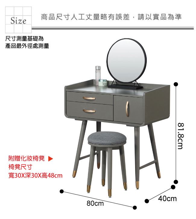 尺寸:(寬)80x(深)40(高)81.8/公分 ◆材質: 材質:防蛀木心板+防鏽噴漆腳套&木質腳座+五金滑軌結構+強化玻璃鏡面 噴漆:防潮耐磨噴漆處理