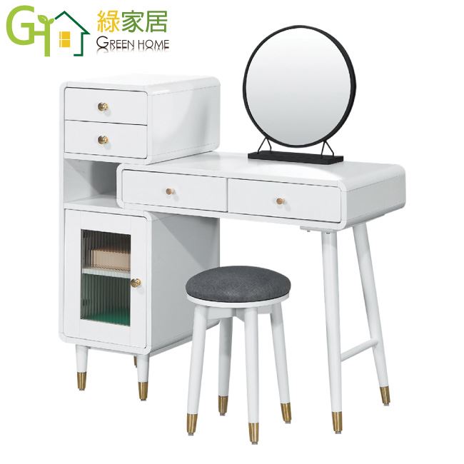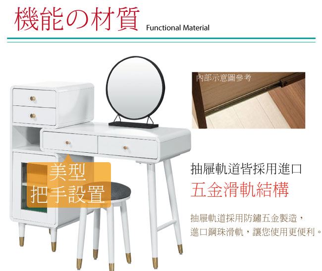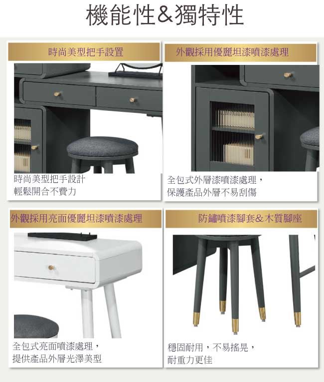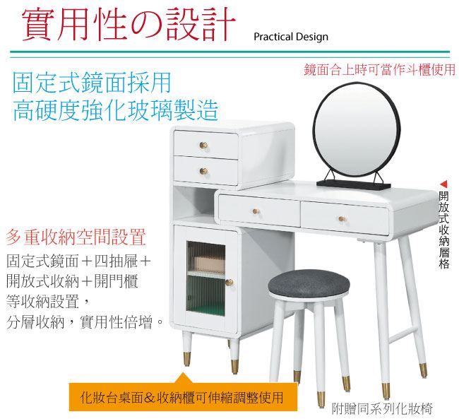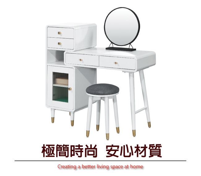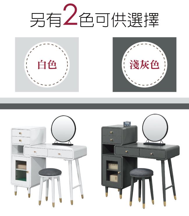 商 品 介 紹 | 【綠家居】卡夢2.7尺固定式鏡面可伸縮鏡台/化妝台組合(二色可選+含化妝椅) 二色可選+鏡台&收納櫃可伸縮使用+現代簡約風格+安心材質製造,整體採用防蛀木心板+防鏽噴漆腳套&木質腳座+五金滑軌結構+強化玻璃鏡面等安心材質製造,產品外層採用防潮耐磨噴漆處理搭配採用固定式鏡面櫃+開門櫃+四抽屜+內&外開放式收納等空間設計,全由專人配送到家,專業安心服務,替你省下更多時間! 【商品特色】 二色可選+鏡台&收納櫃可伸縮使用+安心材質製造,使用放心+搭配居家更便利 採用防蛀木心板+防鏽噴漆腳套&木質腳座+五金滑軌結構+強化玻璃鏡面等安心材質製造 產品外層採用防潮耐磨噴漆處理 搭配採用固定式鏡面櫃+開門櫃+四抽屜+內&外開放式收納等空間設計 此商品不需要DIY組立,此商品為組立後之成品 全由專人配送到家,專業安心服務,替您省下更多時間 |
