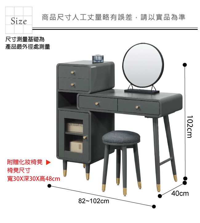 尺寸:(寬)82-102x(深)40(高)102/公分 ◆材質: 材質:防蛀木心板+防鏽噴漆腳套&木質腳座+五金滑軌結構+強化玻璃鏡面 噴漆:防潮耐磨噴漆處理