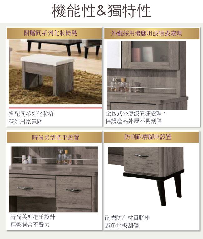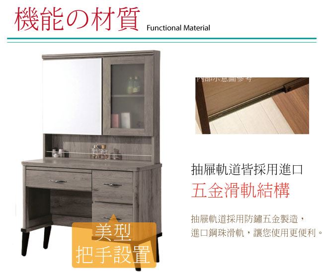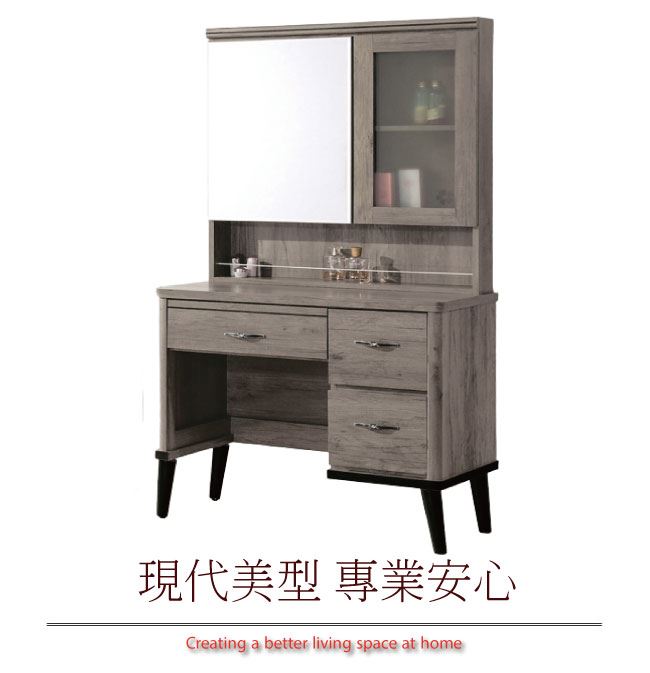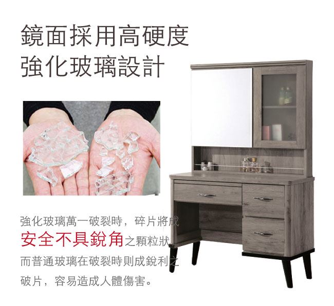 商 品 介 紹 | 【綠家居】查倫 灰橡2.9尺開合式鏡台/化妝台組合(含化妝椅) 灰橡木紋色系+現代簡約風格+安心材質製造,鏡台整體採用防蛀木心板+五金滑軌結構+強化玻璃鏡面+黑鐵砂腳座等安心材質製造,外層採用優利坦全包式耐磨噴漆處理搭配開合式鏡面櫃+三抽屜+開放&隱藏式收納等收納設計,全由專人配送到家,專業安心服務,替你省下更多時間! 【商品特色】 灰橡木紋色系+現代簡約風格+安心材質製造,使用放心+搭配居家更便利 鏡台採用防蛀木心板+五金滑軌結構+強化玻璃鏡面+黑鐵砂腳座等安心材質製造 開合式鏡面櫃+三抽屜+開放&隱藏式收納等收納設計 此商品不需要DIY組立,此商品為組立後之成品 品質保證、專業設計、貼心服務 全由專人配送到家,專業安心服務,替您省下更多時間