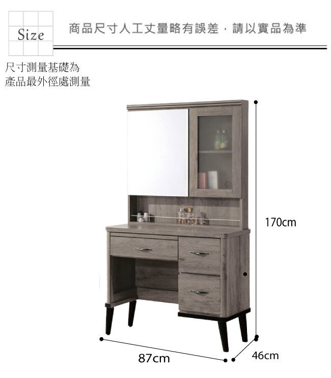 產品名稱:【綠家居】查倫 灰橡2.9尺開合式鏡台/化妝台組合(含化妝椅) 產品尺寸: 尺寸:(寬)87x(深)46x(高)170/公分 ◆材質: 材質:防蛀木心板+黑鐵砂腳座 材質:五金滑軌結構+強化玻璃鏡面 塗漆:優利坦全包式耐磨噴漆處理