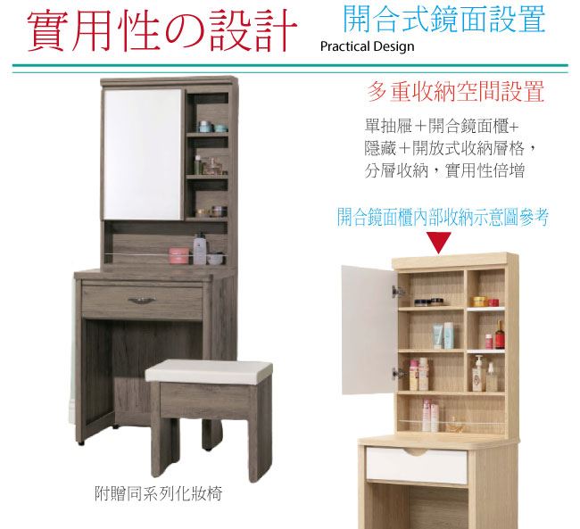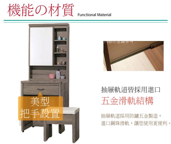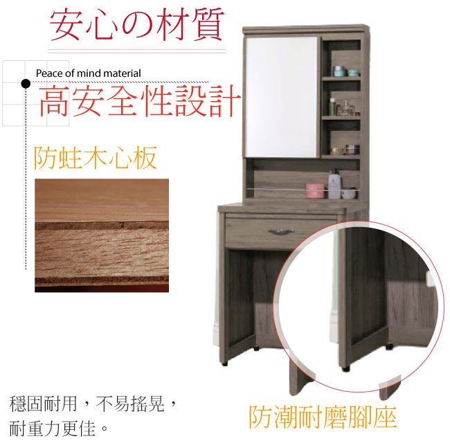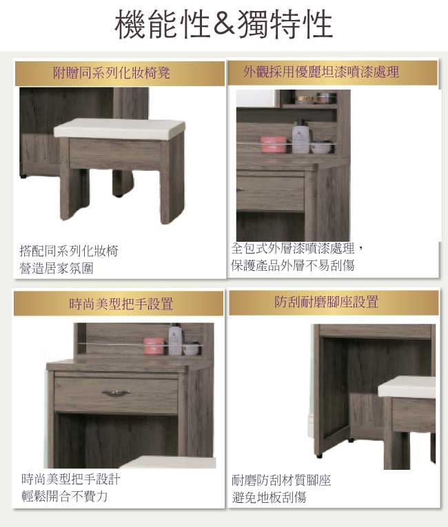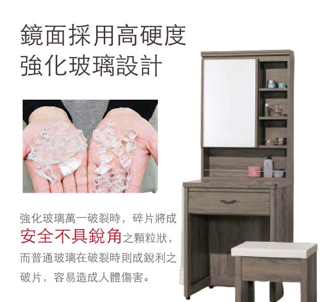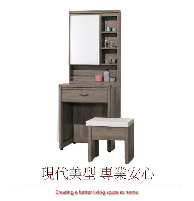 商 品 介 紹 | 【綠家居】查倫 灰橡2尺開合式鏡台/化妝台組合(含化妝椅) 灰橡木紋色系+現代簡約風格+安心材質製造,鏡台整體採用防蛀木心板+五金滑軌結構+強化玻璃鏡面+防潮耐磨腳座等安心材質製造,外層採用優利坦全包式耐磨噴漆處理搭配開合式鏡面櫃+單抽屜+開放&隱藏式收納等收納設計,全由專人配送到家,專業安心服務,替你省下更多時間! 【商品特色】 灰橡木紋色系+現代簡約風格+安心材質製造,使用放心+搭配居家更便利 鏡台採用防蛀木心板+五金滑軌結構+強化玻璃鏡面+防潮耐磨腳座等安心材質製造 開合式鏡面櫃+單抽屜+開放&隱藏式收納等收納設計 此商品不需要DIY組立,此商品為組立後之成品 品質保證、專業設計、貼心服務 全由專人配送到家,專業安心服務,替您省下更多時間