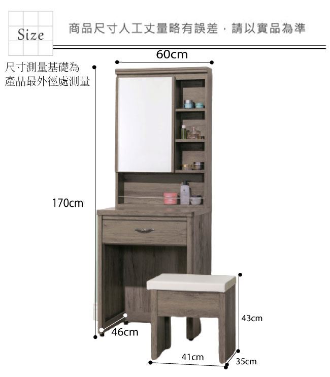 產品名稱:【綠家居】查倫 灰橡2尺開合式鏡台/化妝台組合(含化妝椅) 產品尺寸: 尺寸:(寬)60x(深)46x(高)170/公分 ◆材質: 材質:防蛀木心板+防潮耐磨腳座 材質:五金滑軌結構+強化玻璃鏡面 塗漆:優利坦全包式耐磨噴漆處理