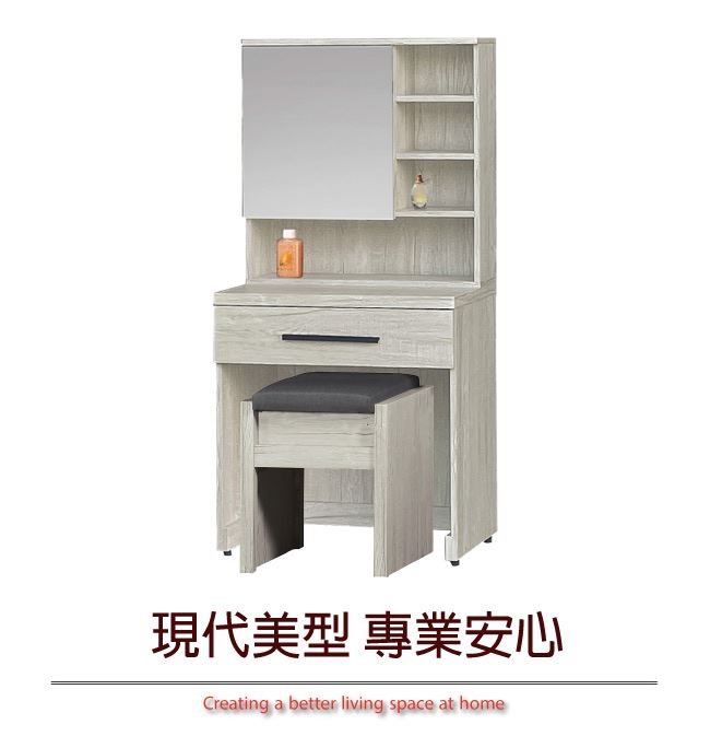 商 品 介 紹 | 【綠家居】夏艾亞淺橡2.5尺開合式鏡面化妝台/鏡台(含化妝椅) 淺橡木紋色系+現代簡約風格+安心材質製造,整體採用防蛀木心板+防刮耐磨腳座+五金滑軌結構+強化玻璃鏡面等安心材質製造,產品外層採用防潮耐磨噴漆處理搭配採用開合式鏡面櫃+單抽屜+開放&隱藏式收納等收納空間設計,全由專人配送到家,專業安心服務,替你省下更多時間! 【商品特色】 淺橡木紋色系+現代簡約風格+安心材質製造,使用放心+搭配居家更便利 採用防蛀木心板+防刮耐磨腳座+五金滑軌結構+強化玻璃鏡面等安心材質製造 產品外層採用防潮耐磨噴漆處理 搭配採用開合式鏡面櫃+單抽屜+開放&隱藏式收納等收納空間設計 此商品不需要DIY組立,此商品為組立後之成品 品質保證、專業設計、貼心服務 全由專人配送到家,專業安心服務,替您省下更多時間