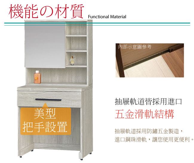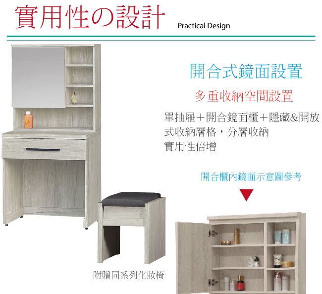 - ◆產品名稱:【綠家居】夏艾亞淺橡2.5尺開合式鏡面化妝台/鏡台(含化妝椅)