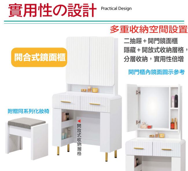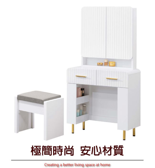 商 品 介 紹 | 【綠家居】培亞輕奢白2.3尺開合鏡面二抽鏡台/化妝台組合(含化妝椅) 輕奢白色系+現代簡約風格+安心材質製造,整體採用防潮MDF板材+防鏽金漆腳座+五金滑軌結構+強化玻璃鏡面等安心材質製造,產品外層採用防潮亮面噴漆處理搭配採用開合鏡面櫃+二抽屜+開放&隱藏式收納等收納空間設計,全由專人配送到家,專業安心服務,替你省下更多時間! 【商品特色】 輕奢白色系+現代簡約風格+安心材質製造,使用放心+搭配居家更便利 採用防潮MDF板材+防鏽金漆腳座+五金滑軌結構+強化玻璃鏡面等安心材質製造 產品外層採用防潮亮面噴漆處理 搭配採用開合鏡面櫃+二抽屜+開放&隱藏式收納等收納空間設計 此商品不需要DIY組立,此商品為組立後之成品 品質保證、專業設計、貼心服務 全由專人配送到家,專業安心服務,替您省下更多時間 |