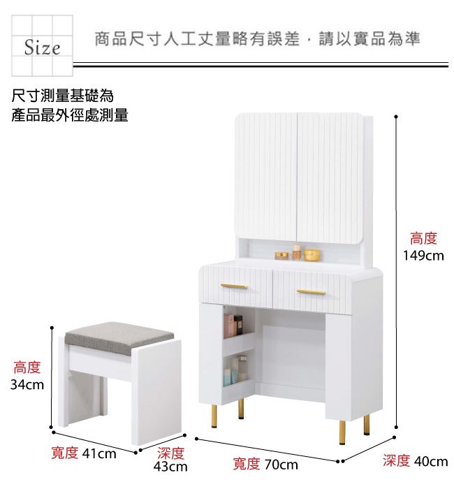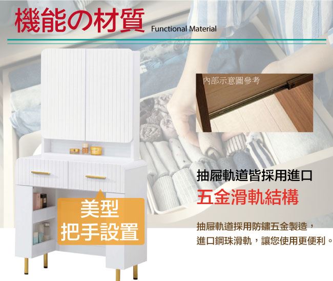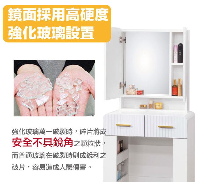 材質 | ◆產品名稱:【綠家居】培亞輕奢白2.3尺開合鏡面二抽鏡台/化妝台組合(含化妝椅) 尺寸:(寬)70x(深)40(高)149/公分 ◆材質: 材質:防潮MDF板材+防鏽金漆腳座+五金滑軌結構+強化玻璃鏡面 噴漆:防潮亮面噴漆處理