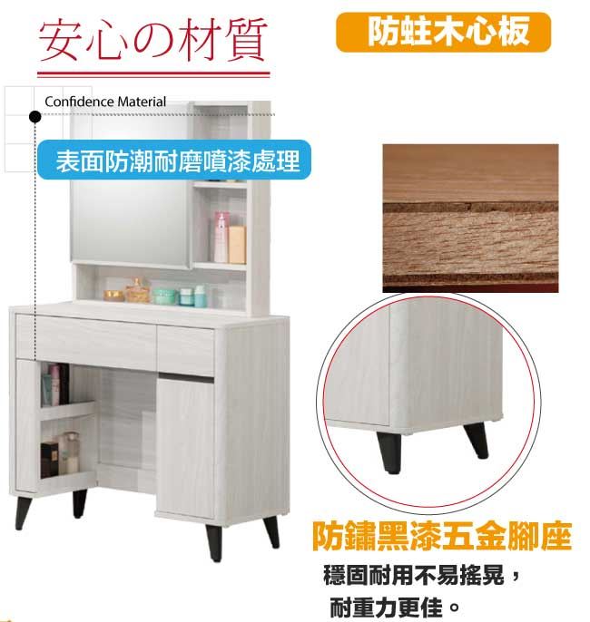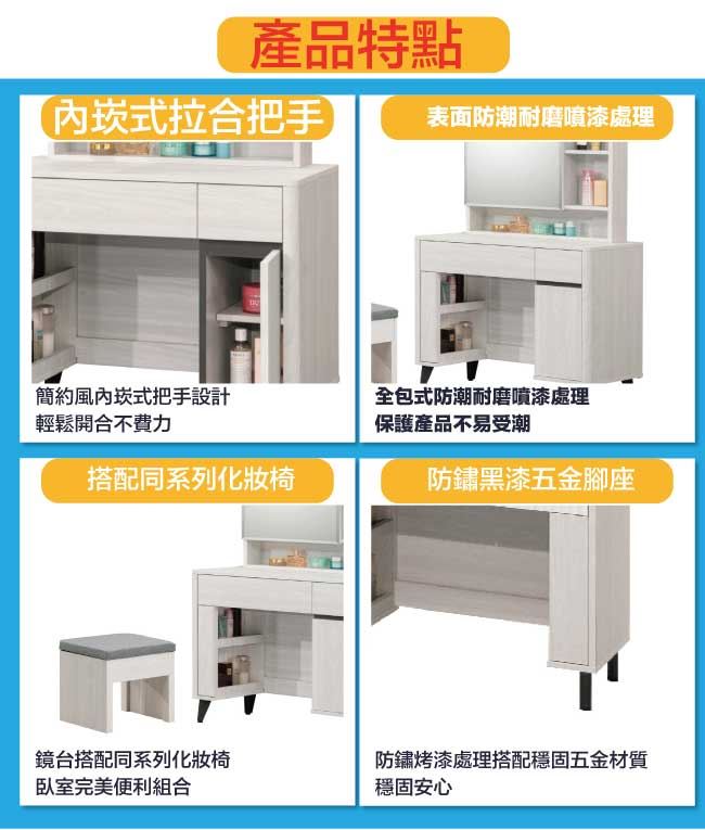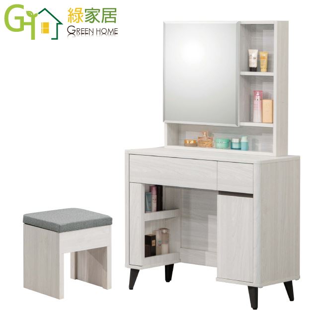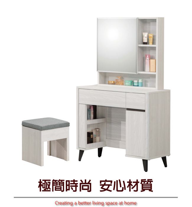 商 品 介 紹 | 【綠家居】聖但尼2.7尺開合鏡面鏡台/化妝台組合(含化妝椅) 雪松木紋色系+現代簡約風格+安心材質製造,整體採用防蛀木心板+防鏽黑漆五金腳座(腳高12cm)+五金滑軌結構+強化玻璃鏡面等安心材質製造,產品外層採用防潮耐磨噴漆處理搭配採用開合鏡面櫃+開門櫃+二抽屜+開放&隱藏式收納等收納空間設計,全由專人配送到家,專業安心服務,替你省下更多時間! 【商品特色】 雪松木紋色系+現代簡約風格+安心材質製造,使用放心+搭配居家更便利 採用防蛀木心板+防鏽黑漆五金腳座(腳高12cm)+五金滑軌結構+強化玻璃鏡面等安心材質製造 產品外層採用防潮耐磨噴漆處理 搭配採用開合鏡面櫃+開門櫃+二抽屜+開放&隱藏式收納等收納空間設計 此商品不需要DIY組立,此商品為組立後之成品 品質保證、專業設計、貼心服務 全由專人配送到家,專業安心服務,替您省下更多時間 |