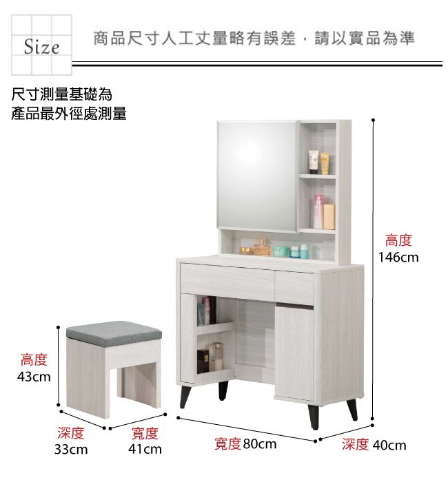 材質 | ◆產品名稱:【綠家居】聖但尼2.7尺開合鏡面鏡台/化妝台組合(含化妝椅) 尺寸:(寬)80x(深)40(高)146/公分 ◆材質: 材質:防蛀木心板+防鏽黑漆五金腳座(腳高12cm)+五金滑軌結構+強化玻璃鏡面 噴漆:防潮耐磨噴漆處理