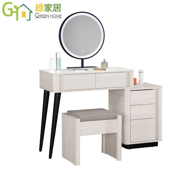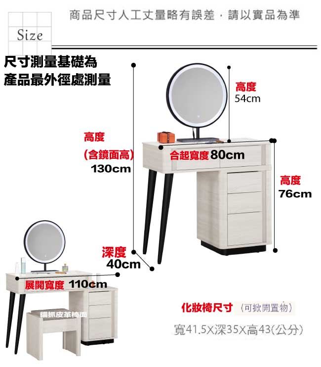 材質 | ◆產品名稱:【綠家居】布沙岩板2.7尺可伸縮鏡面鏡台/化妝台組合(觸控式鏡面+化妝椅) 組合尺寸:(寬)80-110x(深)40(高)130/公分 貓抓皮革坐墊化妝椅尺寸:(寬)41.5x(深)35(高)43/公分 ◆材質: 材質:防蛀木心板+防鏽黑漆五金腳座+五金滑軌結構+12mm高硬度岩板桌面板+強化玻璃鏡面+觸碰式開關LED鏡面燈 噴漆:防潮耐磨噴漆處理