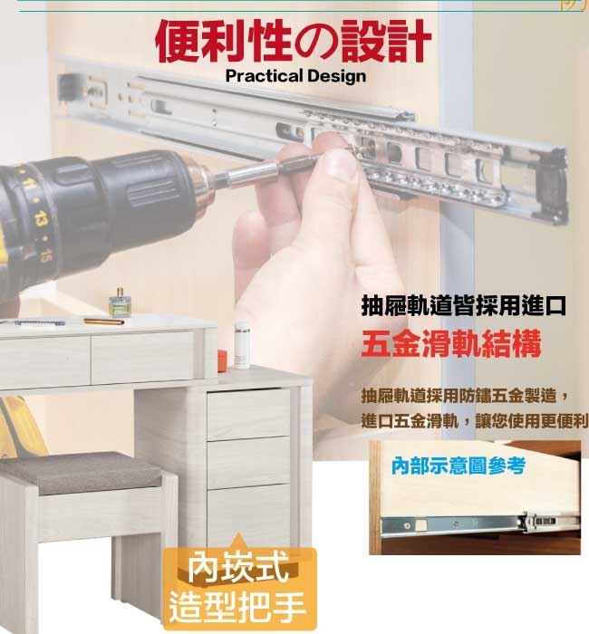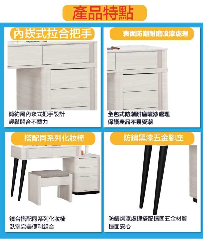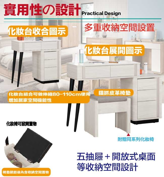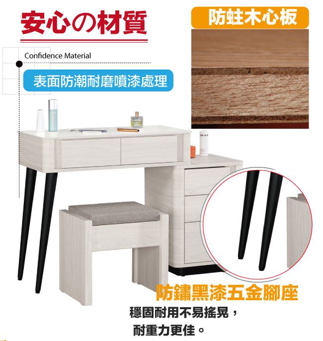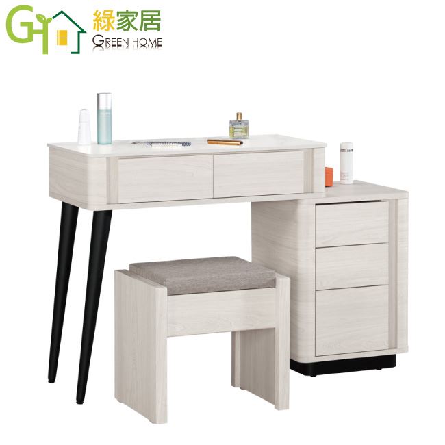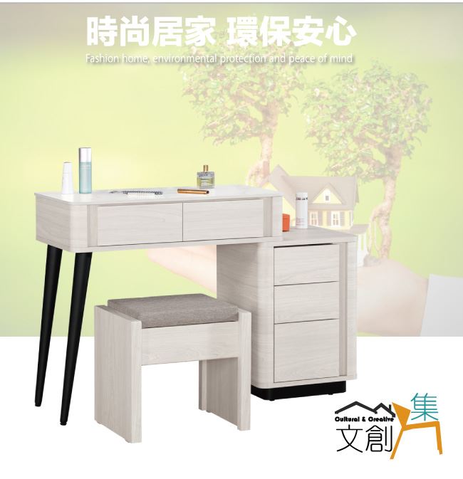 商 品 介 紹 | 【綠家居】布沙岩板2.7尺可伸縮化妝台組合(化妝台+化妝椅+不含鏡面) 淺橡木紋色系+現代簡約風格+安心材質製造,整體採用防蛀木心板+防鏽黑漆五金腳座+五金滑軌結構+12mm高硬度岩板桌面板等安心材質製造,產品外層採用防潮耐磨噴漆處理搭配採用五抽屜+開放式層格+可伸縮80-110cm靈活調整等收納空間設計,全由專人配送到家,專業安心服務,替你省下更多時間! 【商品特色】 淺橡木紋色系+現代簡約風格+安心材質製造,使用放心+搭配居家更便利 化妝台+三抽櫃組合可伸縮使用(寬80-110cm)讓您使用更具便利性 採用防蛀木心板+防鏽黑漆五金腳座+五金滑軌結構+12mm高硬度岩板桌面板等安心材質製造 產品外層採用防潮耐磨噴漆處理 採用五抽屜+開放式層格+可伸縮80-110cm靈活調整等收納空間設計 此商品不需要DIY組立,此商品為組立後之成品 品質保證、專業設計、貼心服務 全由專人配送到家,專業安心服務,替您省下更多時間 |