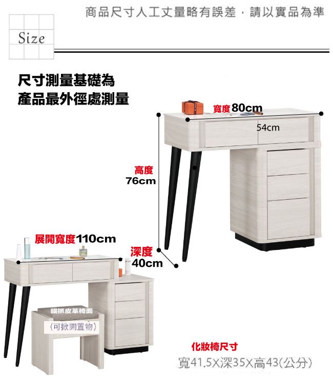 材質 | ◆產品名稱:【綠家居】布沙岩板2.7尺可伸縮化妝台組合(化妝台+化妝椅+不含鏡面) 組合尺寸:(寬)80-110x(深)40(高)76/公分 貓抓皮革坐墊化妝椅尺寸:(寬)41.5x(深)35(高)43/公分 ◆材質: 材質:防蛀木心板+防鏽黑漆五金腳座+五金滑軌結構+12mm高硬度岩板桌面板 噴漆:防潮耐磨噴漆處理