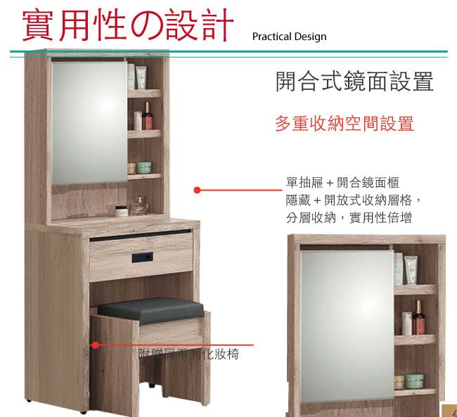 商 品 介 紹 | 【綠家居】倫帝2尺開合式鏡面化妝台/鏡台組合(含化妝椅) 橡木紋色系+現代簡約風格+安心材質製造,整體採用防蛀木心板+防刮耐磨腳座+五金滑軌結構+強化玻璃鏡面等安心材質製造,產品外層採用防潮耐磨噴漆處理搭配採用開合式鏡面櫃+單抽屜+開放&隱藏式收納等收納空間設計,全由專人配送到家,專業安心服務,替你省下更多時間! 【商品特色】 橡木紋色系+現代簡約風格+安心材質製造,使用放心+搭配居家更便利 採用防蛀木心板+防刮耐磨腳座+五金滑軌結構+強化玻璃鏡面等安心材質製造 產品外層採用防潮耐磨噴漆處理 搭配採用開合式鏡面櫃+單抽屜+開放&隱藏式收納等收納空間設計 此商品不需要DIY組立,此商品為組立後之成品 品質保證、專業設計、貼心服務 全由專人配送到家,專業安心服務,替您省下更多時間 |