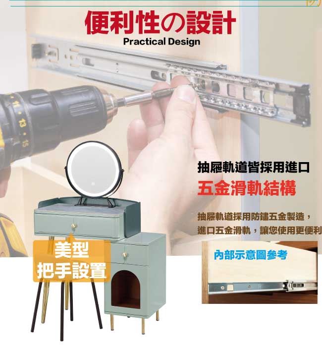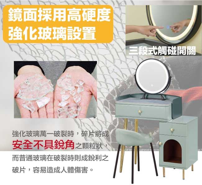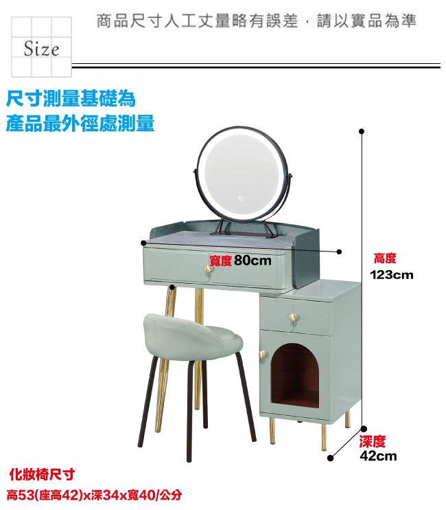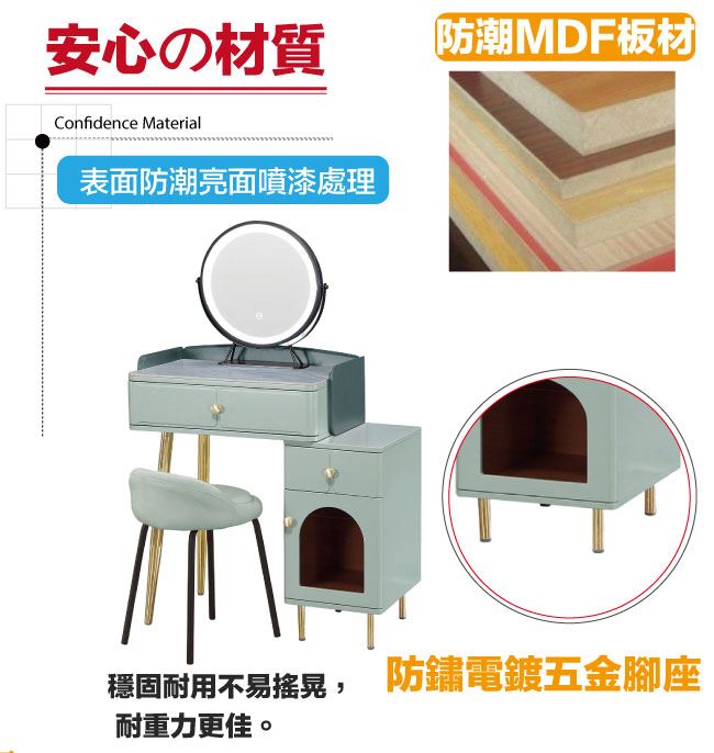 材質 | ◆產品名稱:【綠家居】布林肯岩板2.7尺二抽單門固定鏡面鏡台/化妝台組合(含化妝椅) 組合尺寸:(寬)80x(深)42(高)123/公分 絨布坐墊化妝椅尺寸:(寬)53x(深)34(高)40/公分 ◆材質: 材質:防潮MDF板+防鏽金漆五金腳座+五金滑軌結構+8mm高硬度岩板桌面板+強化玻璃鏡面+觸碰式開關LED鏡面燈 噴漆:防潮耐磨噴漆處理