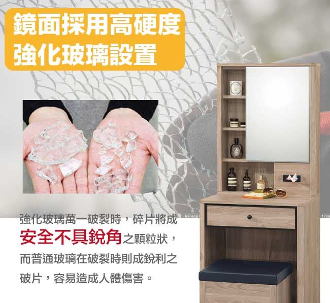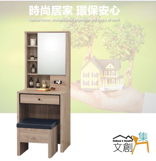 商 品 介 紹 | 【綠家居】路馬爾2尺開合式鏡面化妝台/鏡台組合(含化妝椅) 橡木紋色系+現代簡約風格+安心材質製造,使用放心+搭配居家更便利,整體採用防蛀木心板+防潮耐磨腳座+五金滑軌結構+強化玻璃鏡面等材質搭配外層採用優莉坦耐磨全包式噴漆處理 ,採用開合式鏡面+面紙置放格+單抽屜+開放式收納等收納空間設計,全由專人配送到家,專業安心服務,替你省下更多時間! 【商品特色】 橡木紋色系+現代簡約風格+安心材質製造,使用放心+搭配居家更便利 防蛀木心板+防潮耐磨腳座+五金滑軌結構+強化玻璃鏡面等材質 採用開合式鏡面+面紙置放格+單抽屜+開放式收納等收納空間設計 此商品不需要DIY組立,此商品為組立後之成品 品質保證、專業設計、貼心服務 全由專人配送到家,專業安心服務,替您省下更多時間 |