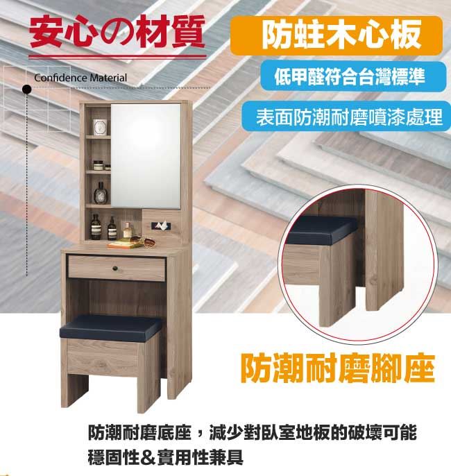 材質 | ◆產品名稱:【綠家居】路馬爾2尺開合式鏡面化妝台/鏡台組合(含化妝椅) 尺寸:(寬)60x(深)40(高)155/公分 ◆材質: 材質:防蛀木心板+防潮耐磨腳座+五金滑軌結構+強化玻璃鏡面 噴漆:防潮耐磨噴漆處理