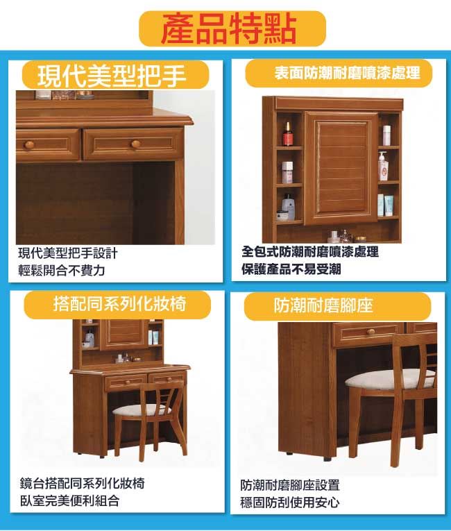 商 品 介 紹 | 【綠家居】杜利絲2.7尺實木開合式鏡面化妝台/鏡台組合(含化妝椅) 樟木紋色系+現代簡約風格+安心材質製造,使用放心+搭配居家更便利,整體採用樟木實木+松木實木+防潮耐磨腳座+五金滑軌結構+強化玻璃鏡面等材質搭配外層採用優莉坦耐磨全包式噴漆處理 ,採用開合式鏡面櫃+二抽屜+開放式空間等收納空間設計,全由專人配送到家,專業安心服務,替你省下更多時間! 【商品特色】 樟木紋色系+現代簡約風格+安心材質製造,使用放心+搭配居家更便利 樟木實木+松木實木+防潮耐磨腳座+五金滑軌結構+強化玻璃鏡面等材質 採用開合式鏡面櫃+二抽屜+開放式空間等收納空間設計 此商品不需要DIY組立,此商品為組立後之成品 品質保證、專業設計、貼心服務 全由專人配送到家,專業安心服務,替您省下更多時間 |
