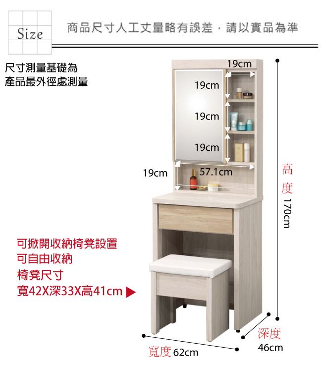 材質 | ◆產品名稱:【綠家居】葛特雙色2.1尺開合式鏡面鏡台組合(含化妝椅) 尺寸:(寬)62x(深)46(高)170/公分 ◆材質: 材質:防蛀木心板+防潮耐磨腳座+五金滑軌結構+強化玻璃鏡面 噴漆:防潮耐磨噴漆處理
