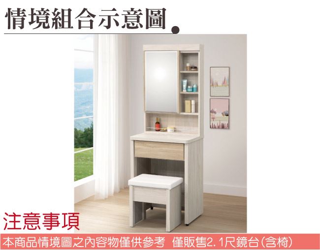 商 品 介 紹 | 【綠家居】葛特雙色2.1尺開合式鏡面鏡台組合(含化妝椅) 木紋雙色系+現代簡約風格+安心材質製造,使用放心+搭配居家更便利,整體採用防蛀木心板+防潮耐磨腳座+五金滑軌結構+強化玻璃鏡面等材質搭配外層採用優莉坦耐磨全包式噴漆處理 ,採用開合式鏡面櫃+開門櫃+單抽屜+開放式收納等收納空間設計,全由專人配送到家,專業安心服務,替你省下更多時間! 【商品特色】 木紋雙色系+現代簡約風格+安心材質製造,使用放心+搭配居家更便利 此組鏡台組合含可收納化妝椅搭配,化妝椅座墊可掀起內含收納層格可用來置放私人物品,增加實用機能性 防蛀木心板+防潮耐磨腳座+五金滑軌結構+強化玻璃鏡面等材質 採用開合式鏡面櫃+開門櫃+單抽屜+開放式收納等收納空間設計 此商品不需要DIY組立,此商品為組立後之成品 品質保證、專業設計、貼心服務 全由專人配送到家,專業安心服務,替您省下更多時間 |