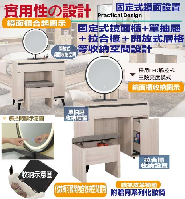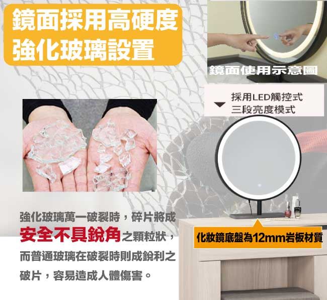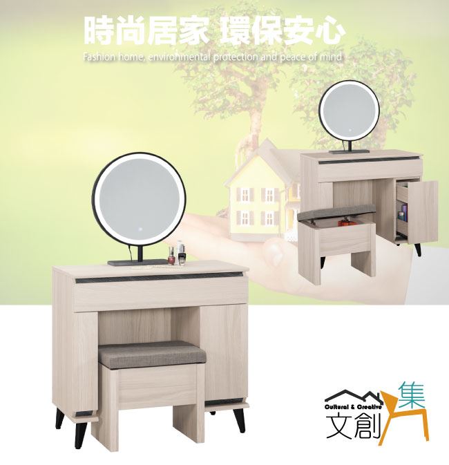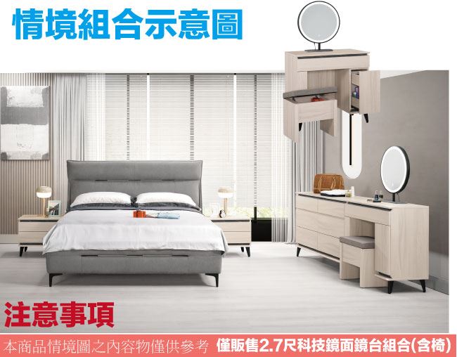 商 品 介 紹 | 【綠家居】納莉爾2.7尺觸控鏡面鏡台組合(含化妝椅) 淺橡木紋色系+現代簡約風格+安心材質製造,使用放心+搭配居家更便利,整體採用防蛀木心板+五金滑軌結構+強化玻璃鏡面(LED&三段可調鏡面)+烤漆金屬腳座等材質搭配外層採用防潮耐磨噴漆處理,採用觸控式鏡面+單抽屜+拉合櫃+內&外開放收納層格等收納空間設計,全由專人配送到家,專業安心服務,替你省下更多時間! 【商品特色】 淺橡木紋色系+現代簡約風格+安心材質製造,使用放心+搭配居家更便利 此組鏡台組合含可收納化妝椅搭配,化妝椅座墊可掀起內含收納層格可用來置放私人物品,增加實用機能性 防蛀木心板+五金滑軌結構+強化玻璃鏡面(LED&三段可調鏡面)+烤漆金屬腳座等材質 採用觸控式鏡面+單抽屜+拉合櫃+內&外開放收納層格等收納空間設計 此商品不需要DIY組立,此商品為組立後之成品 品質保證、專業設計、貼心服務 全由專人配送到家,專業安心服務,替您省下更多時間