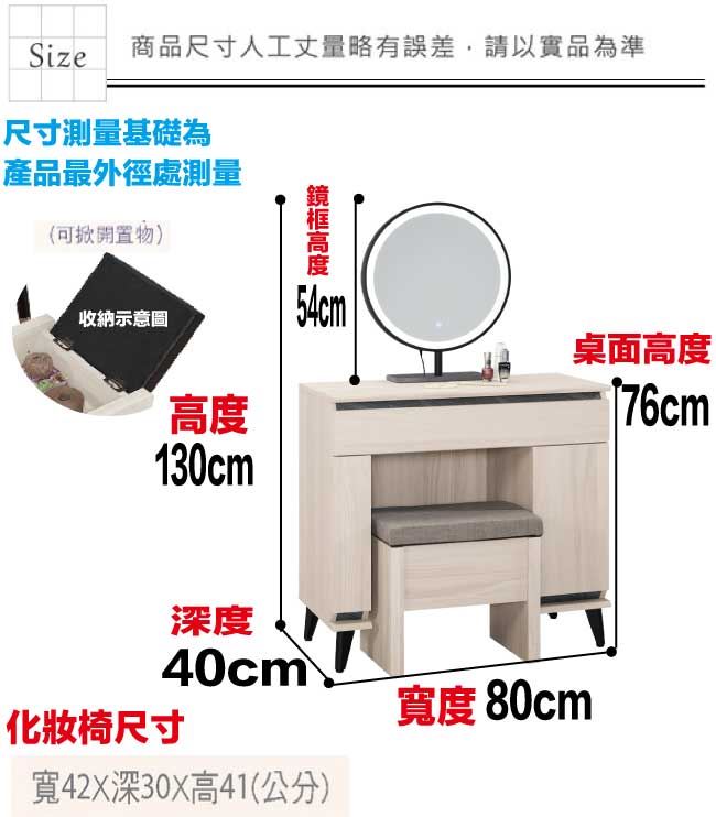 材質 | ◆產品名稱:【綠家居】納莉爾2.7尺觸控鏡面鏡台組合(含化妝椅) 尺寸:(寬)80x(深)40(高)130/公分 ◆材質: 材質:防蛀木心板+五金滑軌結構+強化玻璃鏡面(LED&三段可調鏡面)+烤漆金屬腳座 噴漆:防潮耐磨噴漆處理 |