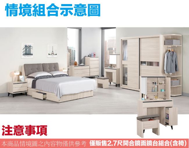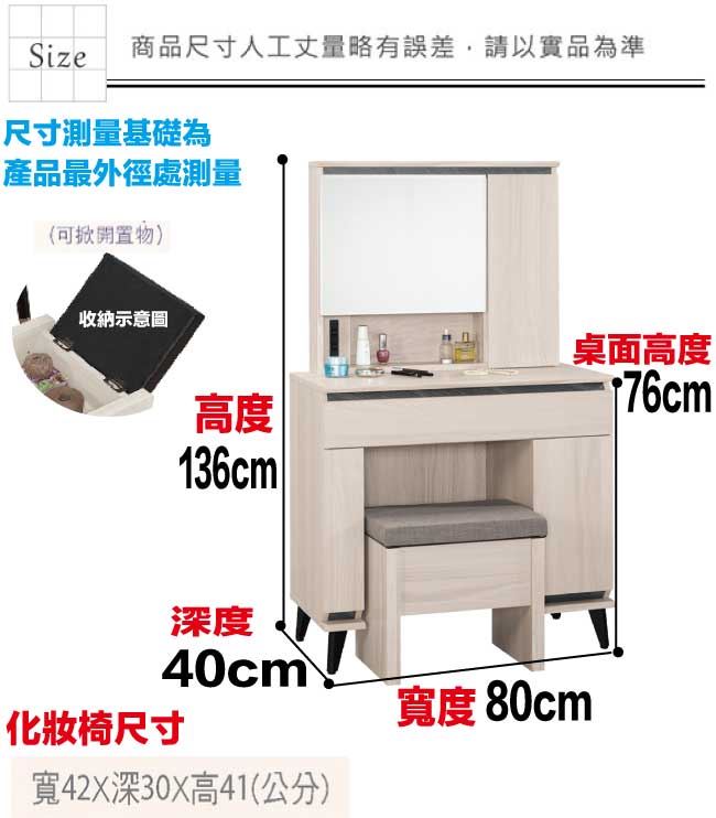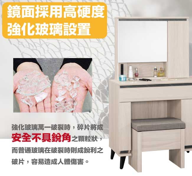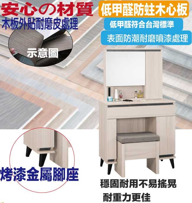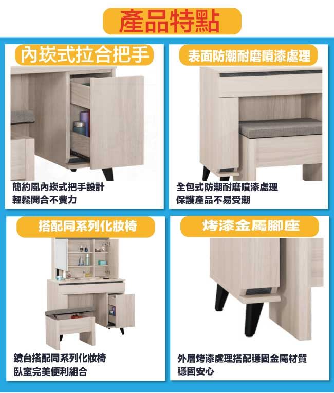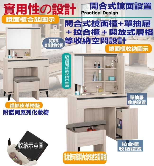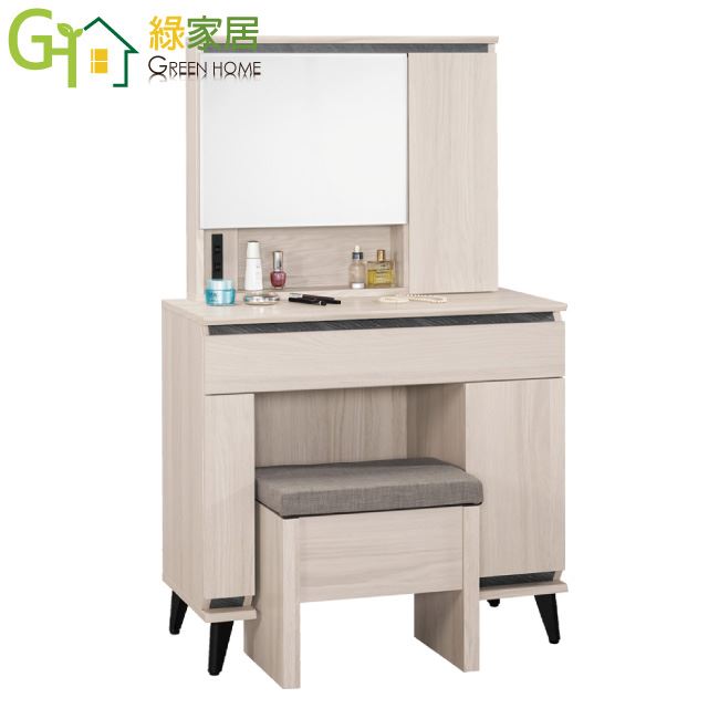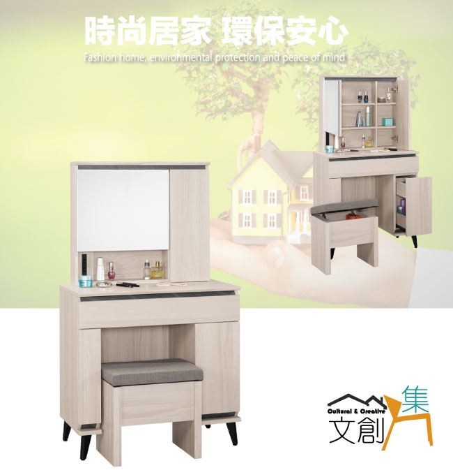 商 品 介 紹 | 【綠家居】納莉爾2.7尺開合式鏡台組合(含化妝椅) 淺橡木紋色系+現代簡約風格+安心材質製造,使用放心+搭配居家更便利,整體採用防蛀木心板+強化玻璃鏡面+烤漆金屬腳座+五金滑軌結構等材質搭配外層採用防潮耐磨噴漆處理,採用開合式鏡面櫃+單抽屜+拉合櫃+內&外開放收納層格等收納空間設計,全由專人配送到家,專業安心服務,替你省下更多時間! 【商品特色】 淺橡木紋色系+現代簡約風格+安心材質製造,使用放心+搭配居家更便利 此組鏡台組合含可收納化妝椅搭配,化妝椅座墊可掀起內含收納層格可用來置放私人物品,增加實用機能性 防蛀木心板+五金滑軌結構+強化玻璃鏡面+烤漆金屬腳座等材質 採用開合式鏡面櫃+單抽屜+拉合櫃+內&外開放收納層格等收納空間設計 此商品不需要DIY組立,此商品為組立後之成品 品質保證、專業設計、貼心服務 全由專人配送到家,專業安心服務,替您省下更多時間