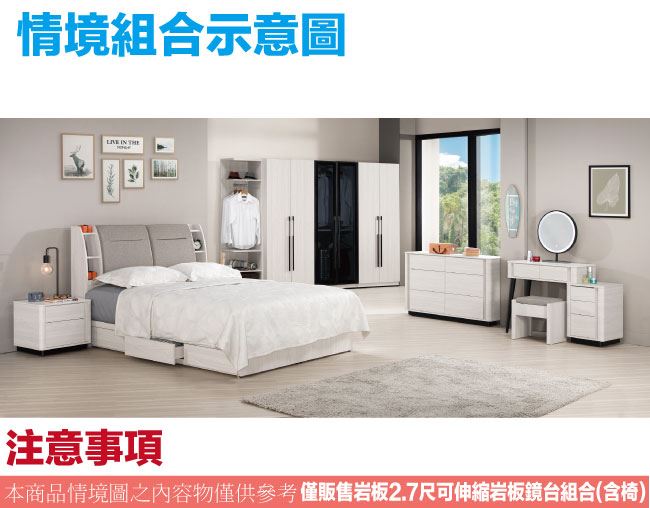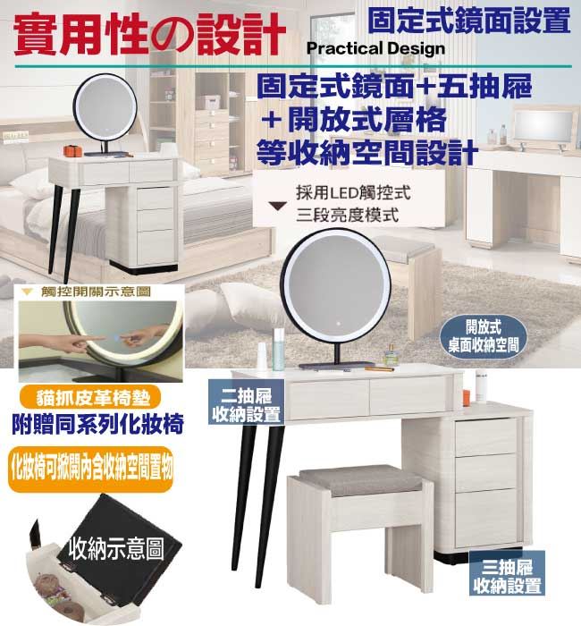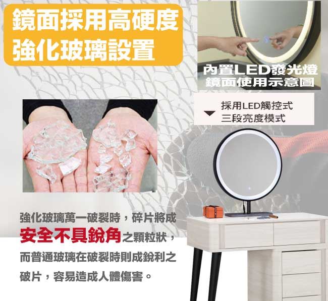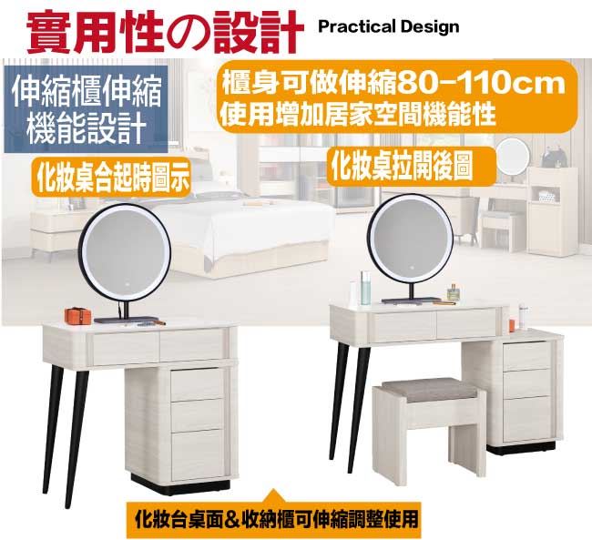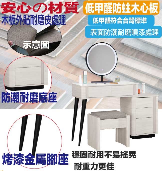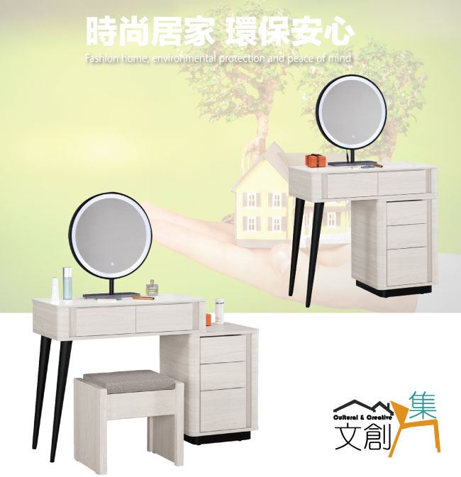 商 品 介 紹 | 【綠家居】莉諾爾岩板2.7尺觸控伸縮鏡台組合(含化妝椅) 淺橡木紋色系+現代簡約風格+安心材質製造,使用放心+搭配居家更便利,整體採用防蛀木心板+強化玻璃鏡面(LED&三段可調鏡面)+防潮耐磨腳座+烤漆金屬腳座+12mm高硬度岩板桌面板+五金滑軌結構等材質搭配外層採用防潮耐磨噴漆處理,採用觸控式鏡面+五抽屜+內&外開放收納層格等收納空間設計,全由專人配送到家,專業安心服務,替你省下更多時間! 【商品特色】 淺橡木紋色系+現代簡約風格+安心材質製造,使用放心+搭配居家更便利 化妝鏡台櫃身可伸縮80-110cm設計,讓您可依據實際空間進行擺設調整 此組鏡台組合含可收納化妝椅搭配,化妝椅座墊可掀起內含收納層格可用來置放私人物品,增加實用機能性 防蛀木心板+防潮耐磨腳座+五金滑軌結構+強化玻璃鏡面(LED&三段可調鏡面)+烤漆金屬腳座+12mm高硬度岩板桌面板等材質 採用觸控式鏡面+五抽屜+內&外開放收納層格等收納空間設計 此商品不需要DIY組立,此商品為組立後之成品 品質保證、專業設計、貼心服務 全由專人配送到家,專業安心服務,替您省下更多時間