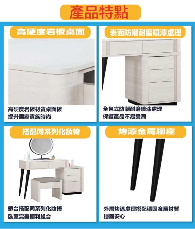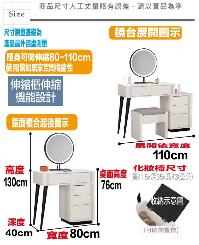 材質 | ◆產品名稱:【綠家居】莉諾爾岩板2.7尺觸控伸縮鏡台組合(含化妝椅) 尺寸:(寬)80-110x(深)40(高)130/公分 ◆材質: 材質:防蛀木心板+防潮耐磨腳座+五金滑軌結構+強化玻璃鏡面(LED&三段可調鏡面)+烤漆金屬腳座+12mm高硬度岩板桌面板 噴漆:防潮耐磨噴漆處理 |