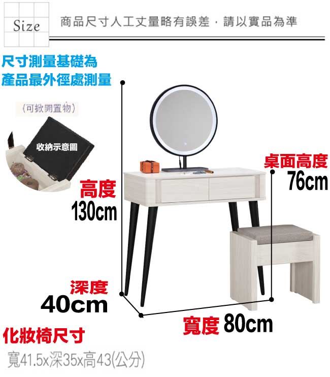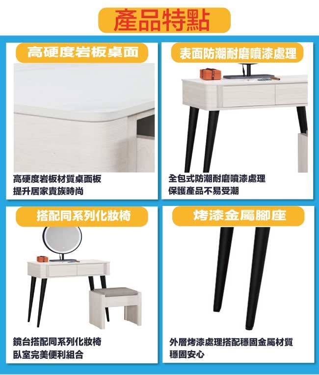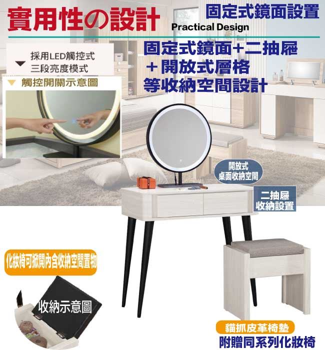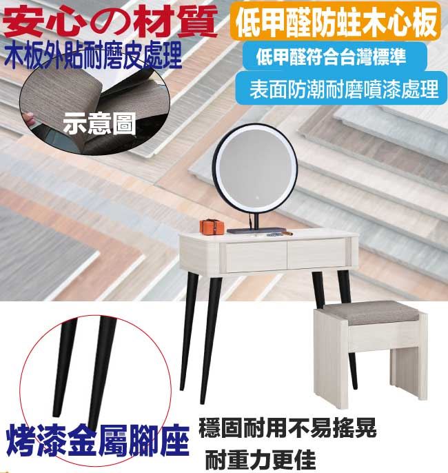 商 品 介 紹 | 【綠家居】莉諾爾岩板2.7尺觸控鏡面鏡台組合(含化妝椅) 淺橡木紋色系+現代簡約風格+安心材質製造,使用放心+搭配居家更便利,整體採用防蛀木心板+強化玻璃鏡面(LED&三段可調鏡面)+烤漆金屬腳座+12mm高硬度岩板桌面板+五金滑軌結構等材質搭配外層採用防潮耐磨噴漆處理,採用觸控式鏡面+二抽屜+開放式桌面等收納空間設計,全由專人配送到家,專業安心服務,替你省下更多時間! 【商品特色】 淺橡木紋色系+現代簡約風格+安心材質製造,使用放心+搭配居家更便利 此組鏡台組合含可收納化妝椅搭配,化妝椅座墊可掀起內含收納層格可用來置放私人物品,增加實用機能性 防蛀木心板+五金滑軌結構+強化玻璃鏡面(LED&三段可調鏡面)+烤漆金屬腳座+12mm高硬度岩板桌面板等材質 採用觸控式鏡面+二抽屜+開放式桌面等收納空間設計 此商品不需要DIY組立,此商品為組立後之成品 品質保證、專業設計、貼心服務 全由專人配送到家,專業安心服務,替您省下更多時間