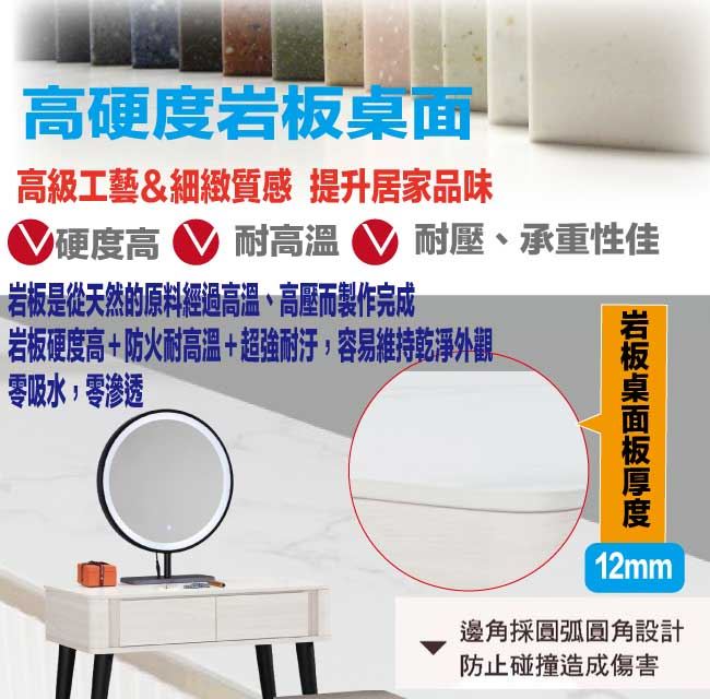 材質 | ◆產品名稱:【綠家居】莉諾爾岩板2.7尺觸控鏡面鏡台組合(含化妝椅) 尺寸:(寬)80x(深)40(高)130/公分 ◆材質: 材質:防蛀木心板+五金滑軌結構+強化玻璃鏡面(LED&三段可調鏡面)+烤漆金屬腳座+12mm高硬度岩板桌面板 噴漆:防潮耐磨噴漆處理 |