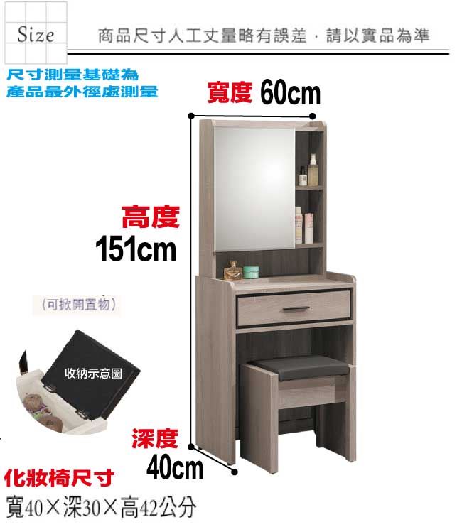 材質 | ◆產品名稱:【綠家居】悅卡2尺開合式鏡台組合(二色可選+含化妝椅) 尺寸:(寬)60x(深)40x(高)151/公分 ◆材質: 材質:防蛀木心板+五金滑軌結構+強化玻璃鏡面+防潮耐磨底座 噴漆:防潮耐磨噴漆處理 |