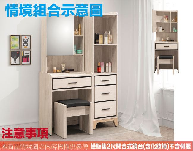 商 品 介 紹 | 【綠家居】悅卡2尺開合式鏡台組合(二色可選+含化妝椅) 二色可選+現代簡約風格+安心材質製造,使用放心+搭配居家更便利,整體採用防蛀木心板+五金滑軌結構+強化玻璃鏡面+防潮耐磨底座+防夾手緩衝門片五金等材質搭配外層採用防潮耐磨噴漆處理,採用開合式鏡面櫃+單抽屜+內&外開放層格等收納空間設計,全由專人配送到家,專業安心服務,替你省下更多時間! 【商品特色】 二色可選+現代簡約風格+安心材質製造,使用放心+搭配居家更便利 此組鏡台組合含可收納化妝椅搭配,化妝椅座墊可掀起內含收納層格可用來置放私人物品,增加實用機能性 防蛀木心板+五金滑軌結構+強化玻璃鏡面+防潮耐磨底座+防夾手緩衝門片五金等材質 採用開合式鏡面櫃+單抽屜+內&外開放層格等收納空間設計 此商品不需要DIY組立,此商品為組立後之成品 品質保證、專業設計、貼心服務 全由專人配送到家,專業安心服務,替您省下更多時間