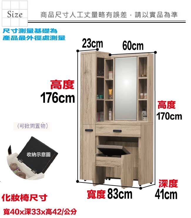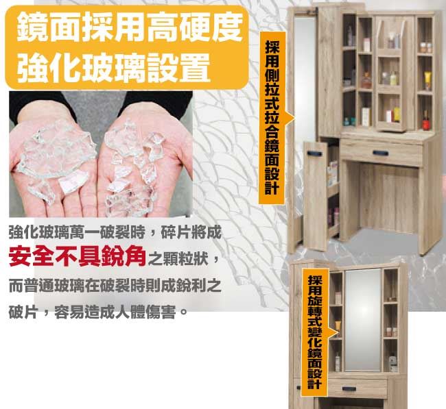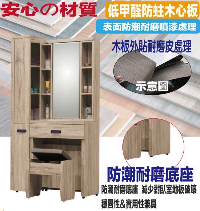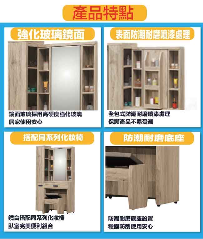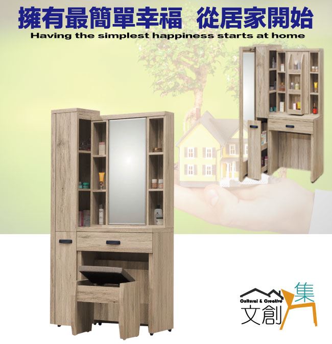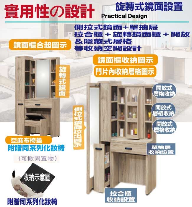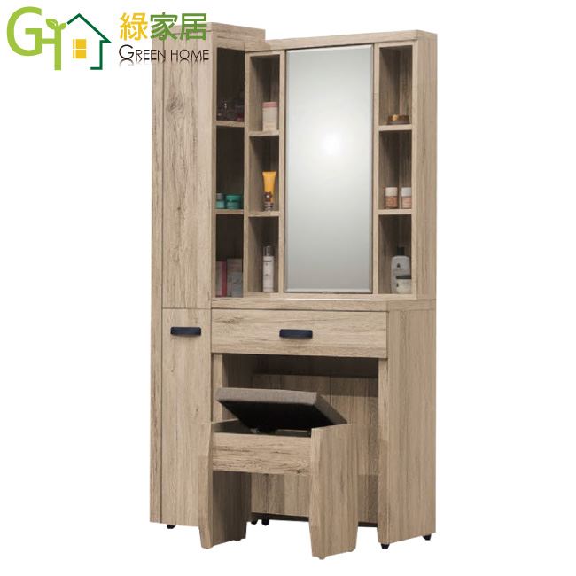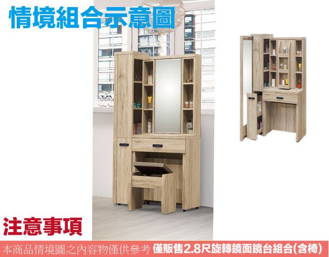商 品 介 紹 | 【綠家居】克提拉2.8尺旋轉式鏡面鏡台組合(側拉式鏡面+含化妝椅) 橡木紋色系+現代簡約風格+安心材質製造,使用放心+搭配居家更便利,整體採用防蛀木心板+五金滑軌結構+強化玻璃鏡面+防潮耐磨底座等材質搭配外層採用防潮耐磨噴漆處理,採用旋轉式鏡面櫃+拉合櫃+單抽屜+側拉式鏡面+內&外開放層格等收納空間設計,全由專人配送到家,專業安心服務,替你省下更多時間! 【商品特色】 橡木紋色系+現代簡約風格+安心材質製造,使用放心+搭配居家更便利 此組鏡台組合含可收納化妝椅搭配,化妝椅座墊可掀起內含收納層格可用來置放私人物品,增加實用機能性 防蛀木心板+五金滑軌結構+強化玻璃鏡面+防潮耐磨底座等材質製造 採用旋轉式鏡面櫃+拉合櫃+單抽屜+側拉式鏡面+內&外開放層格等收納空間設計 此商品不需要DIY組立,此商品為組立後之成品 品質保證、專業設計、貼心服務 全由專人配送到家,專業安心服務,替您省下更多時間