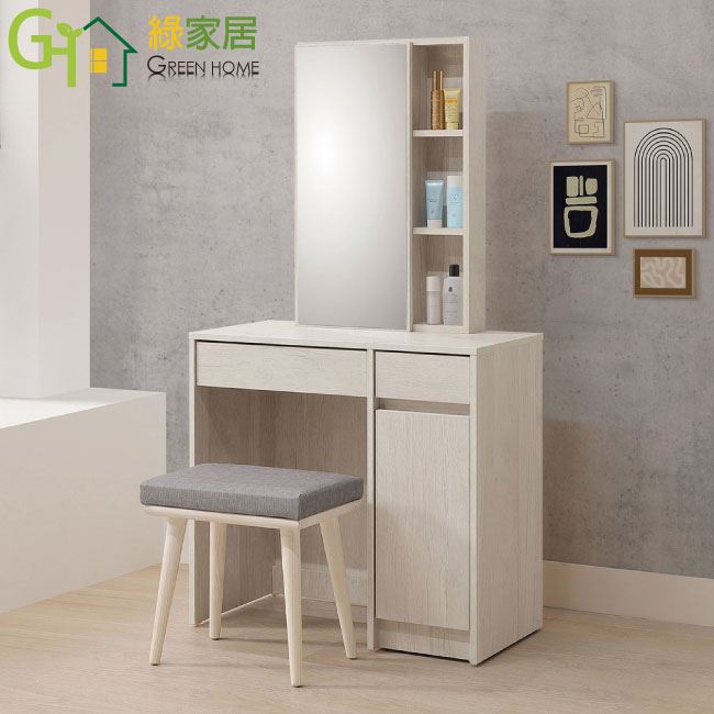 商 品 介 紹 | 【綠家居】斯巴雅2.7尺開合式鏡台組合(含化妝椅) 淺橡木紋色系+現代簡約風格+安心材質製造,使用放心+搭配居家更便利,整體採用防蛀木心板+五金滑軌結構+強化玻璃鏡面+防潮耐磨底座+防夾手緩衝門片五金等材質搭配外層採用防潮耐磨噴漆處理,採用開合式鏡面櫃+二抽屜+開門櫃+內&外開放收納層格等收納空間設計,全由專人配送到家,專業安心服務,替你省下更多時間! 【商品特色】 淺橡木紋色系+現代簡約風格+安心材質製造,使用放心+搭配居家更便利 防蛀木心板+五金滑軌結構+強化玻璃鏡面+防潮耐磨底座+防夾手緩衝門片五金等材質 採用開合式鏡面櫃+二抽屜+開門櫃+內&外開放收納層格等收納空間設計 此商品不需要DIY組立,此商品為組立後之成品 品質保證、專業設計、貼心服務 全由專人配送到家,專業安心服務,替您省下更多時間