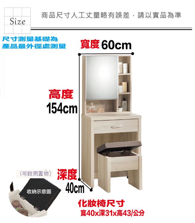 材質 | ◆產品名稱:【綠家居】法緹2尺開合式鏡面鏡台組合(含化妝椅) 尺寸:(寬)60x(深)40x(高)154/公分 ◆材質: 材質:防蛀木心板+防潮耐磨底座+強化玻璃鏡面+五金滑軌結構 噴漆:防潮耐磨噴漆處理 |