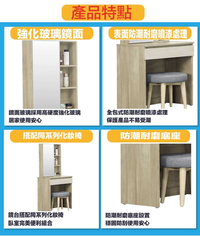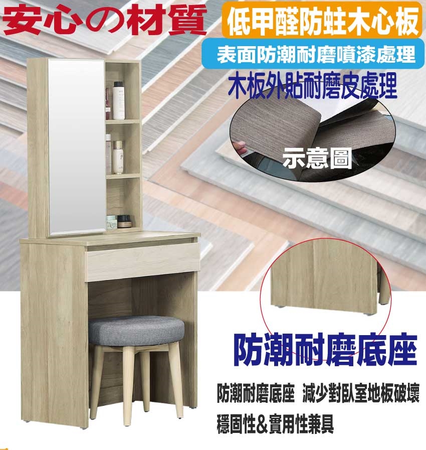 採用防蛀木心板+防潮耐磨底座+五金滑軌結構+強化玻璃鏡面等安心材質製造