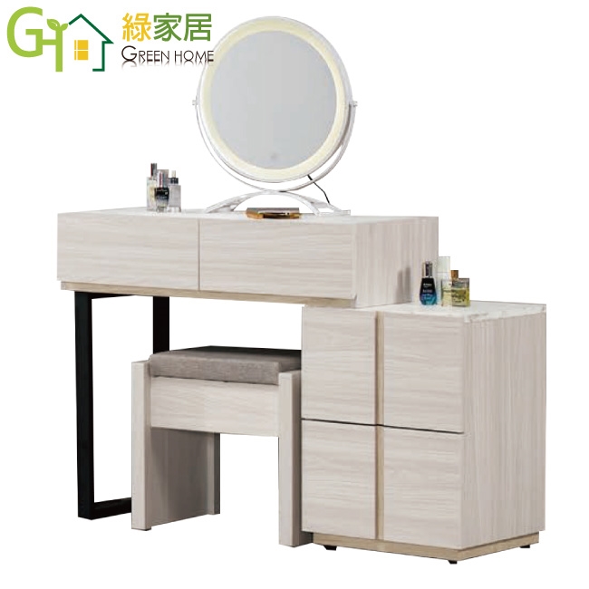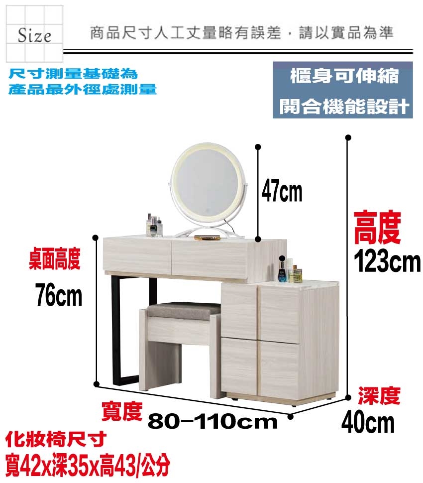 鏡台櫃身寬度可伸縮80-110公分調整使用搭配可掀蓋收納化妝椅凳,滿足您居家空間使用便利性