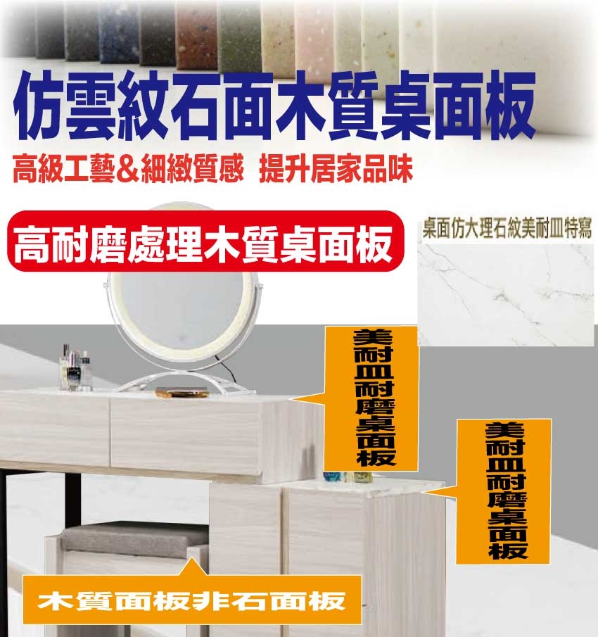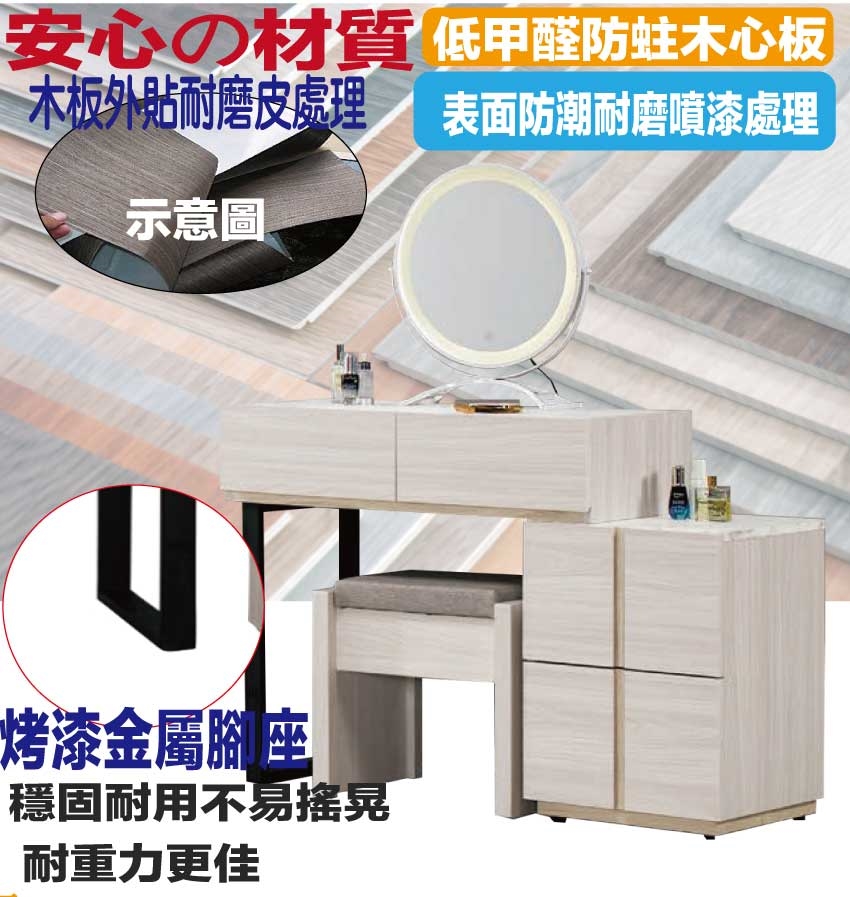 採用防蛀木心板+防潮耐磨底座+五金滑軌結構+強化玻璃鏡面+烤漆金屬腳座+耐磨美耐皿材質面板等安心材質製造