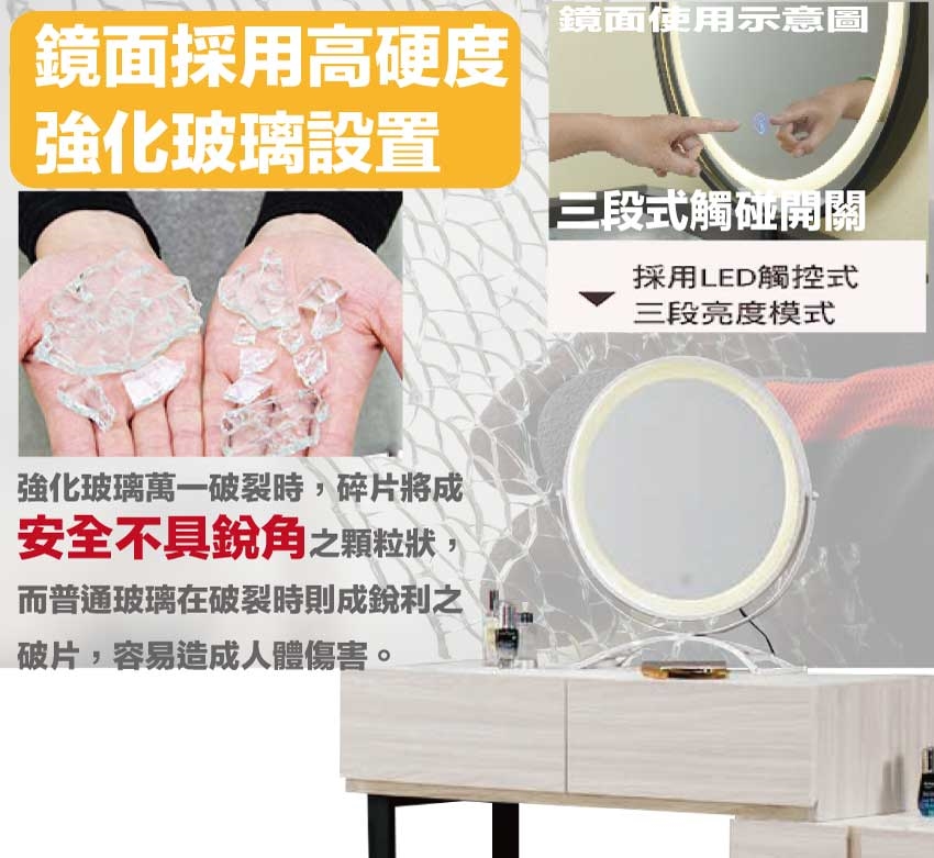 材質:防蛀木心板+防潮耐磨底座+五金滑軌結構+強化玻璃鏡面+烤漆金屬腳座+耐磨美耐皿材質面板