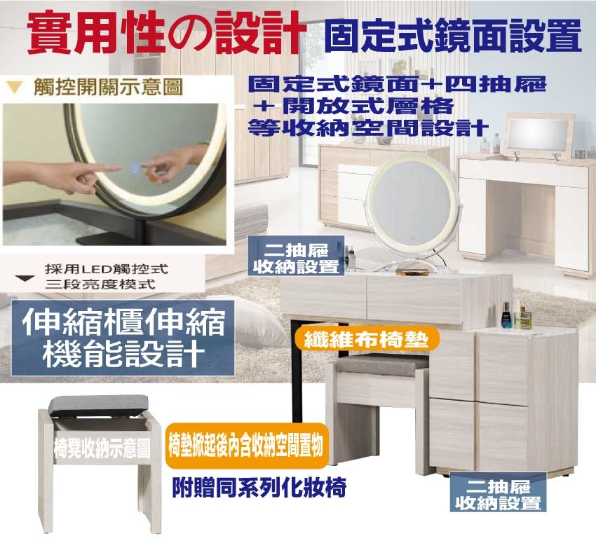 搭配採用固定觸控鏡面架+四抽屜+內&外開放層格等收納空間設計