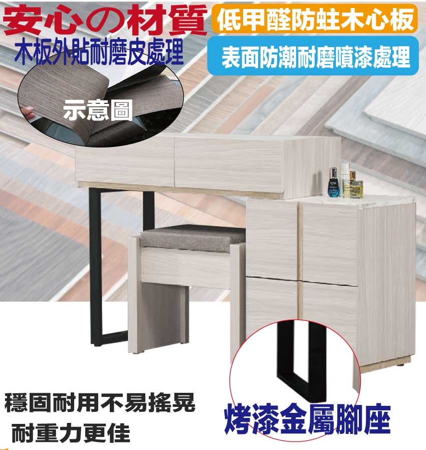 採用防蛀木心板+防潮耐磨底座+五金滑軌結構+烤漆金屬腳座+耐磨美耐皿材質面板等安心材質製造