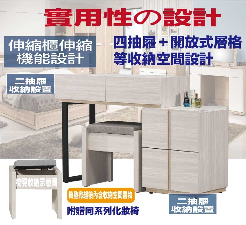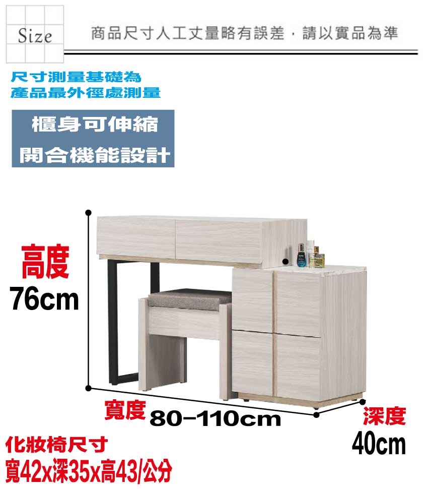 鏡台櫃身寬度可伸縮80-110公分調整使用搭配可掀蓋收納化妝椅凳,滿足您居家空間使用便利性