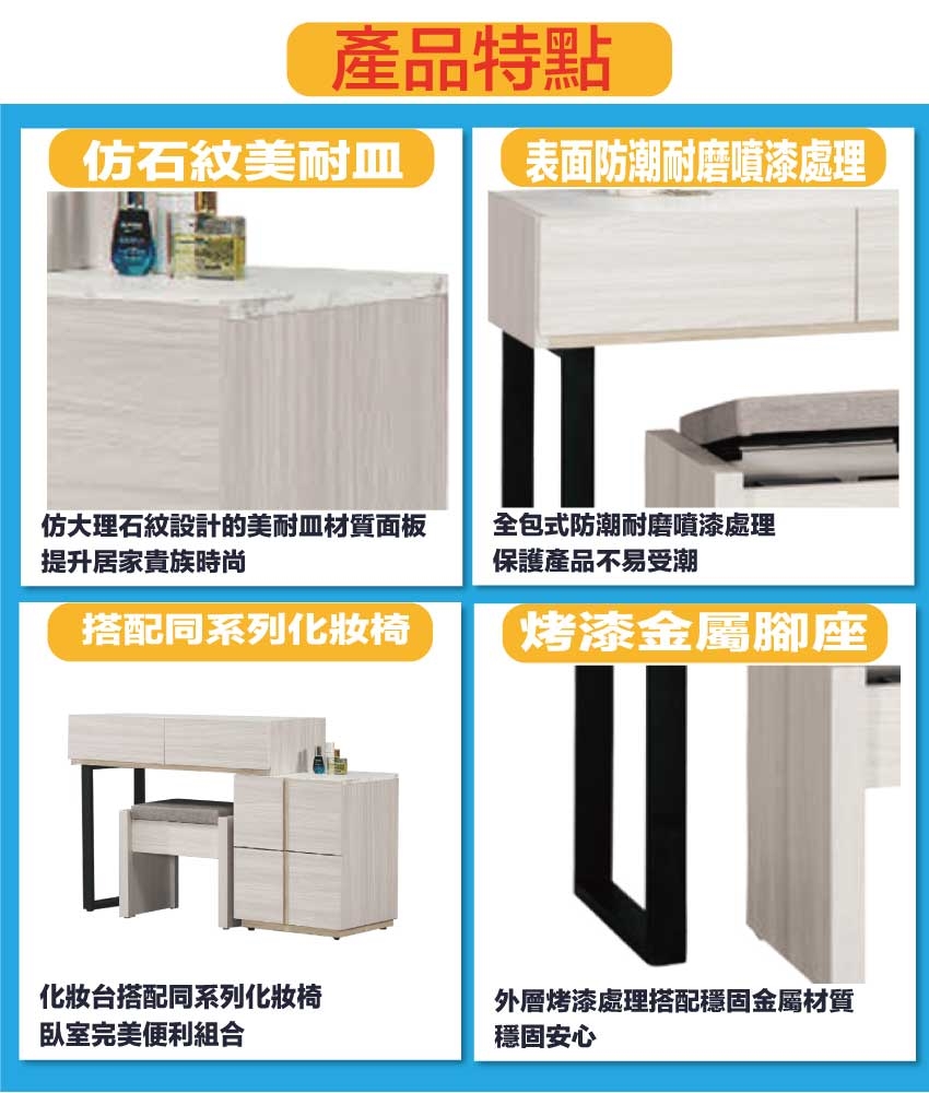 - ◆產品名稱:【綠家居】寶亞2.7尺可伸縮化妝台下座組合(含化妝椅)