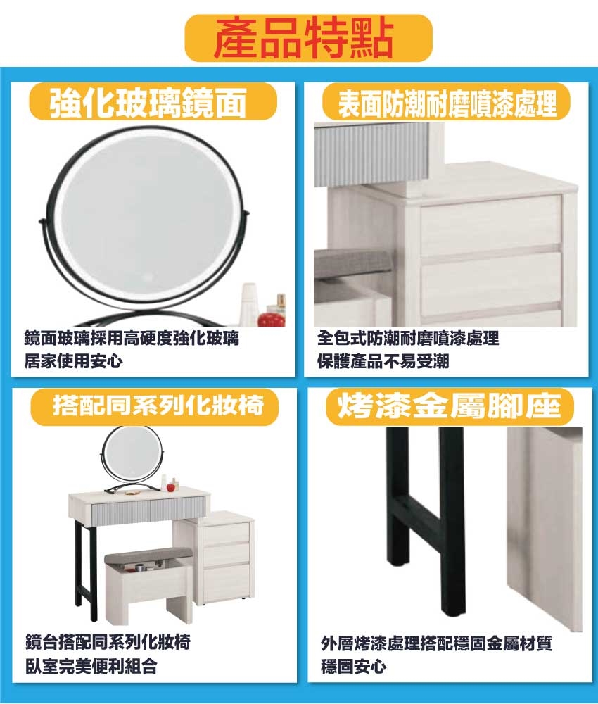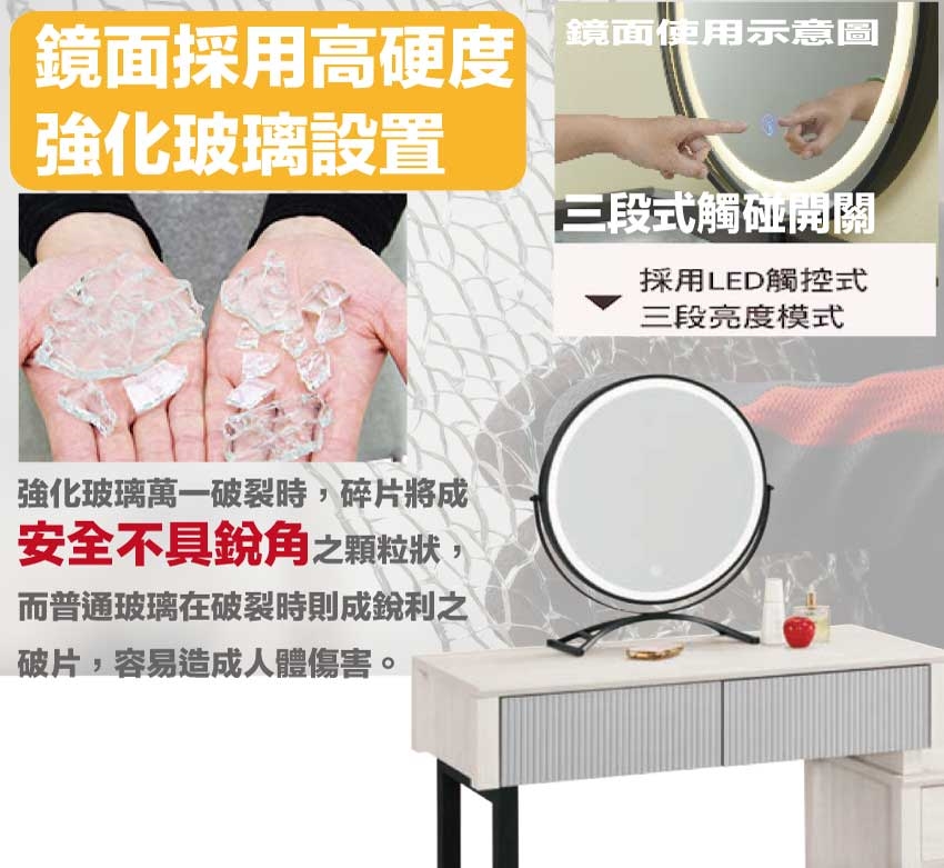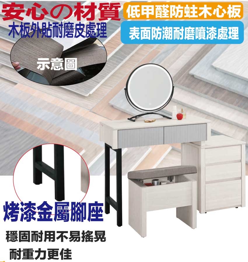 採用防蛀木心板+五金滑軌結構+強化玻璃鏡面+烤漆金屬腳座等安心材質製造