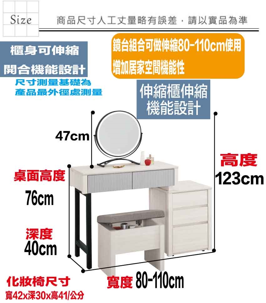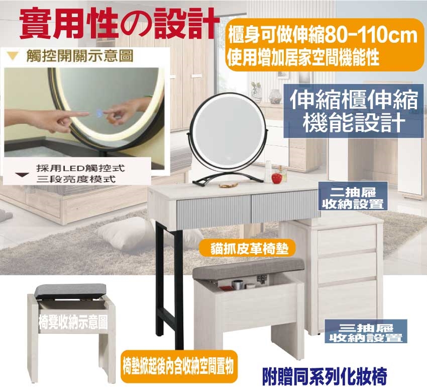 鏡台櫃身寬度可調整80-110cm使用搭配可掀蓋收納化妝椅凳,滿足您居家空間使用便利性