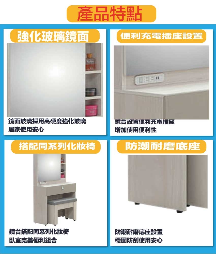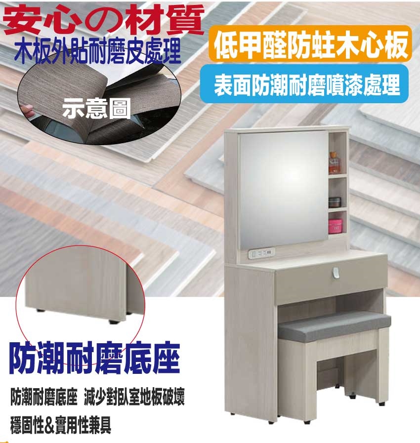 採用防蛀木心板+防潮耐磨底座+五金滑軌結構+強化玻璃鏡面等安心材質製造