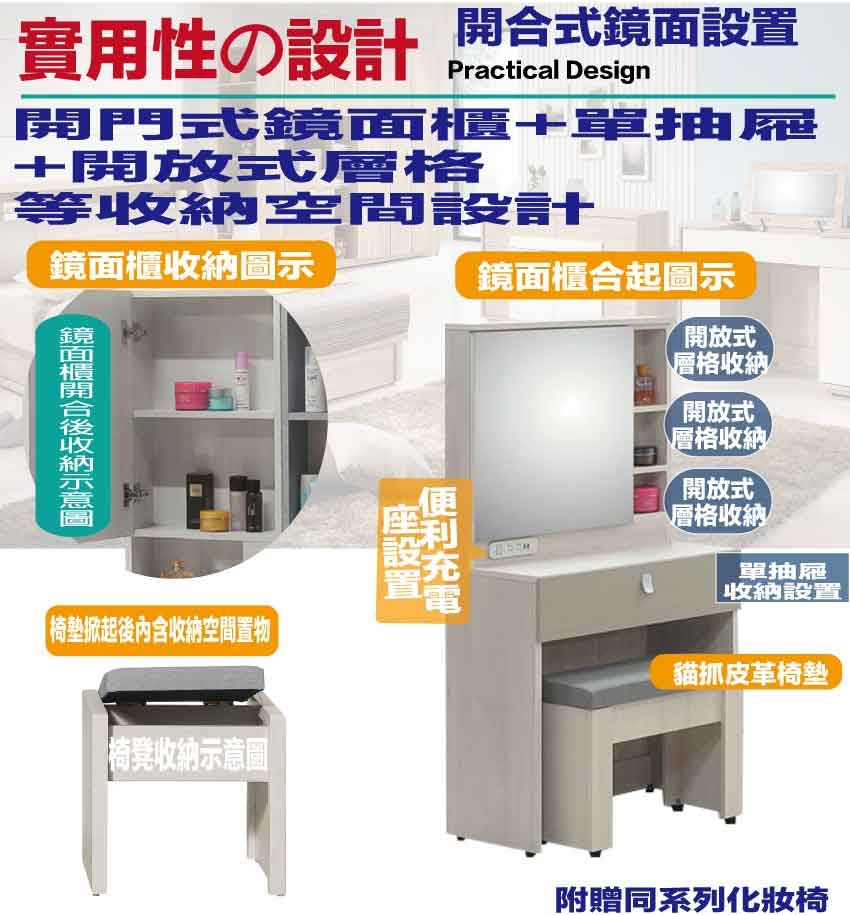 鏡台搭附可收納椅凳採用坐墊可上掀後內置收納空間的便利性設計