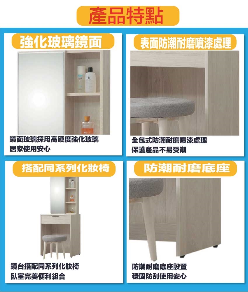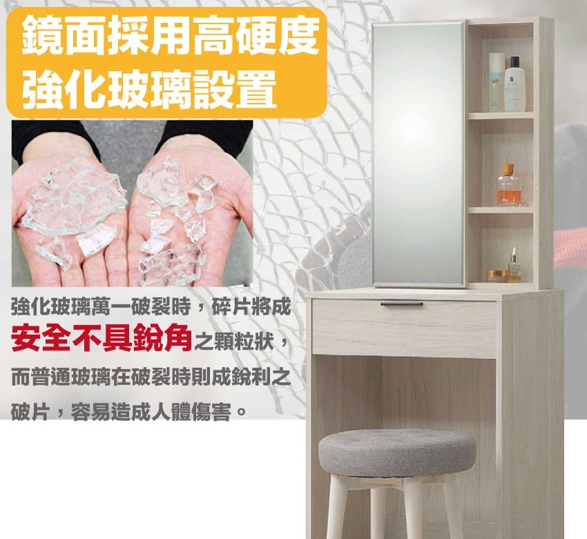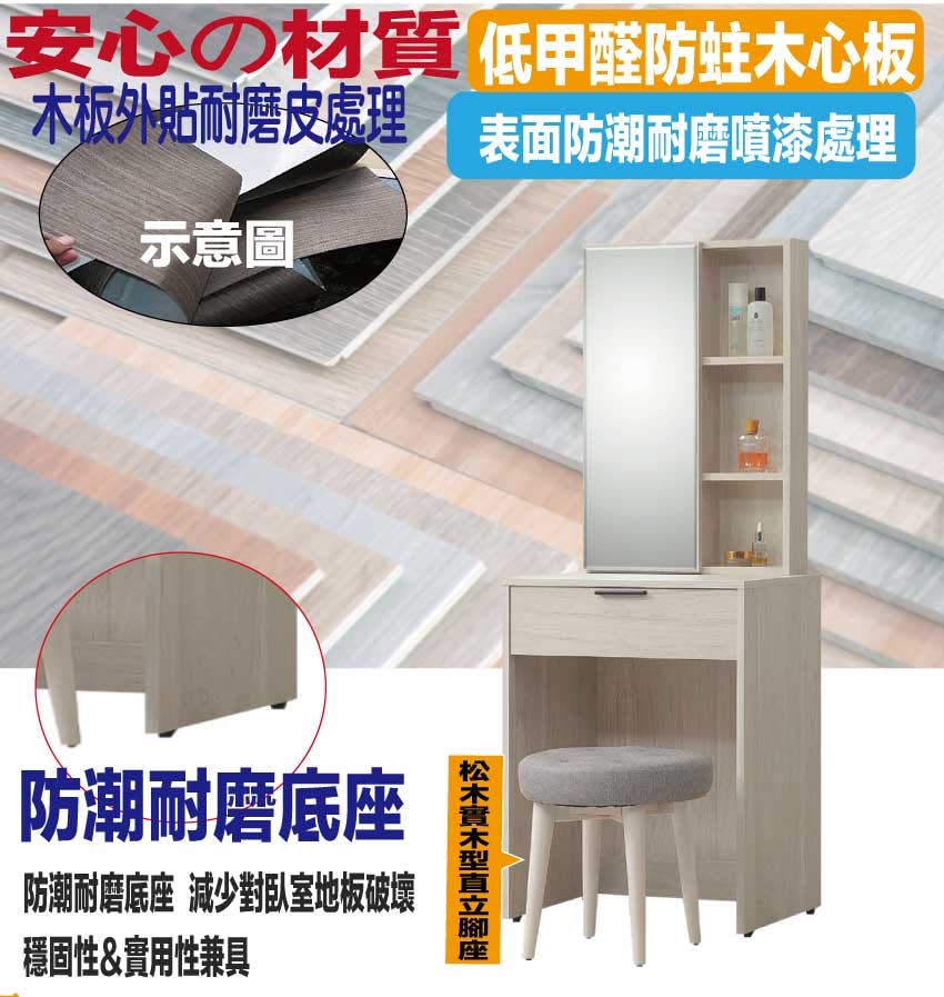 採用防蛀木心板+防潮耐磨底座+五金滑軌結構+強化玻璃鏡面+化妝椅實木腳座+貓抓皮革坐墊等安心材質製造