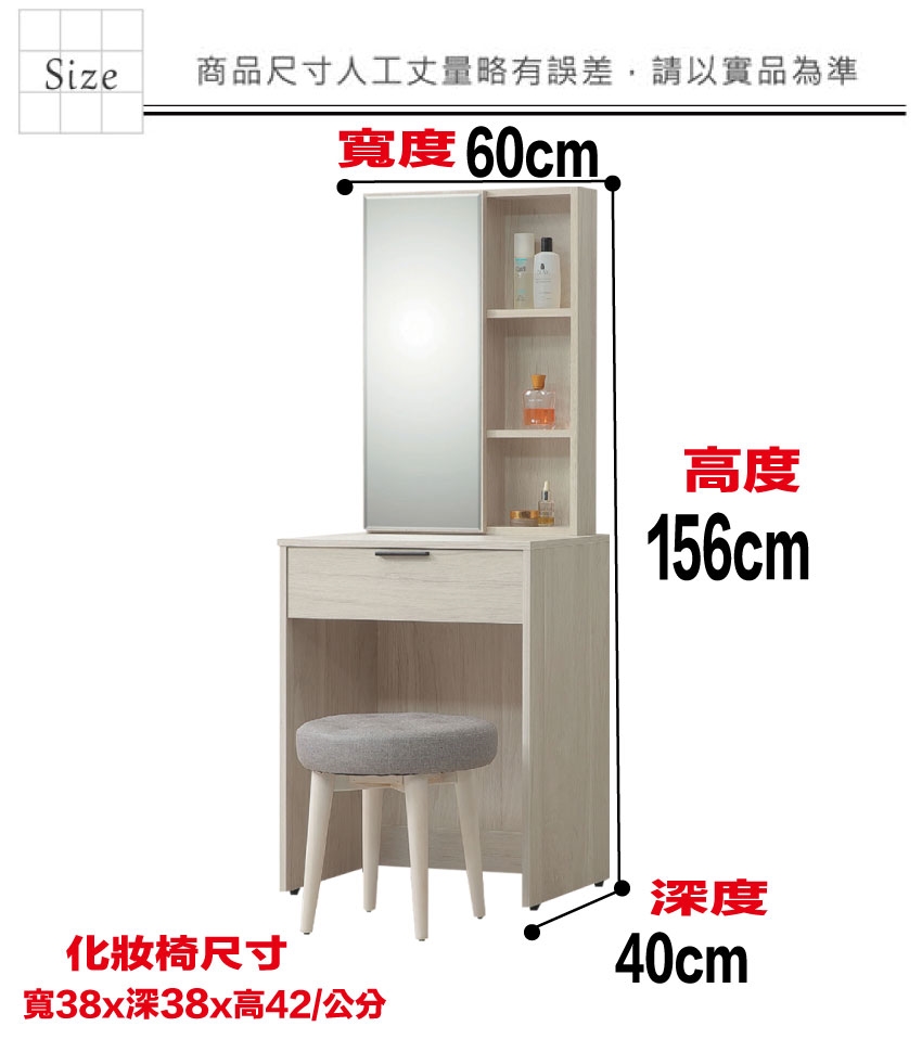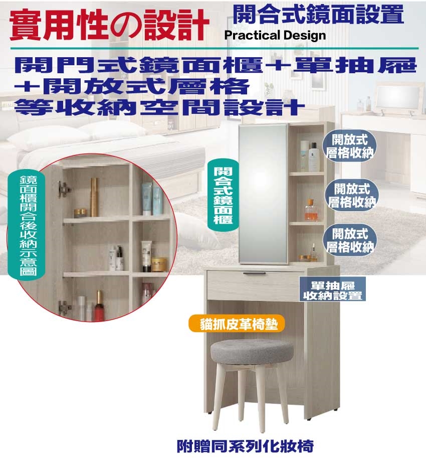 材質:防蛀木心板+防潮耐磨腳座+五金滑軌結構+強化玻璃鏡面+化妝椅實木腳座+貓抓皮革坐墊